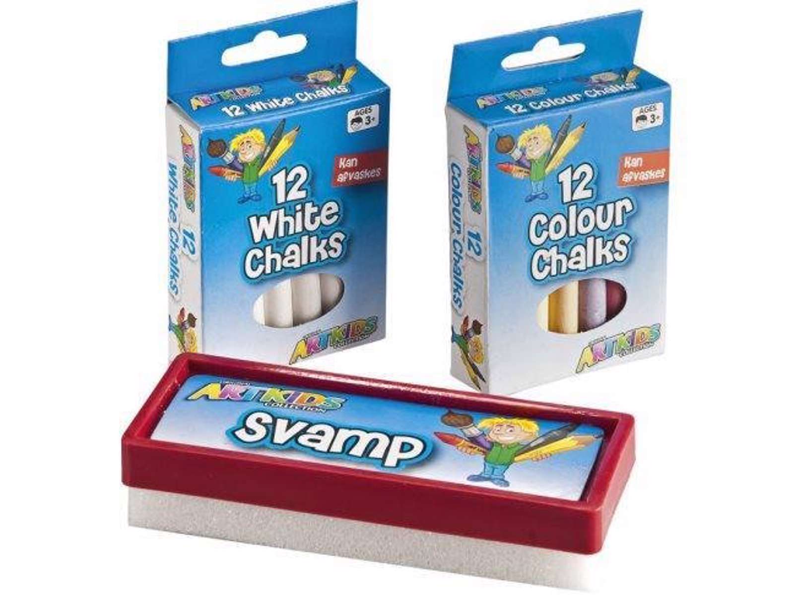 Dette sæt indeholder 12 hvide kridt, 12 farvede kridt og en tavlesvamp.