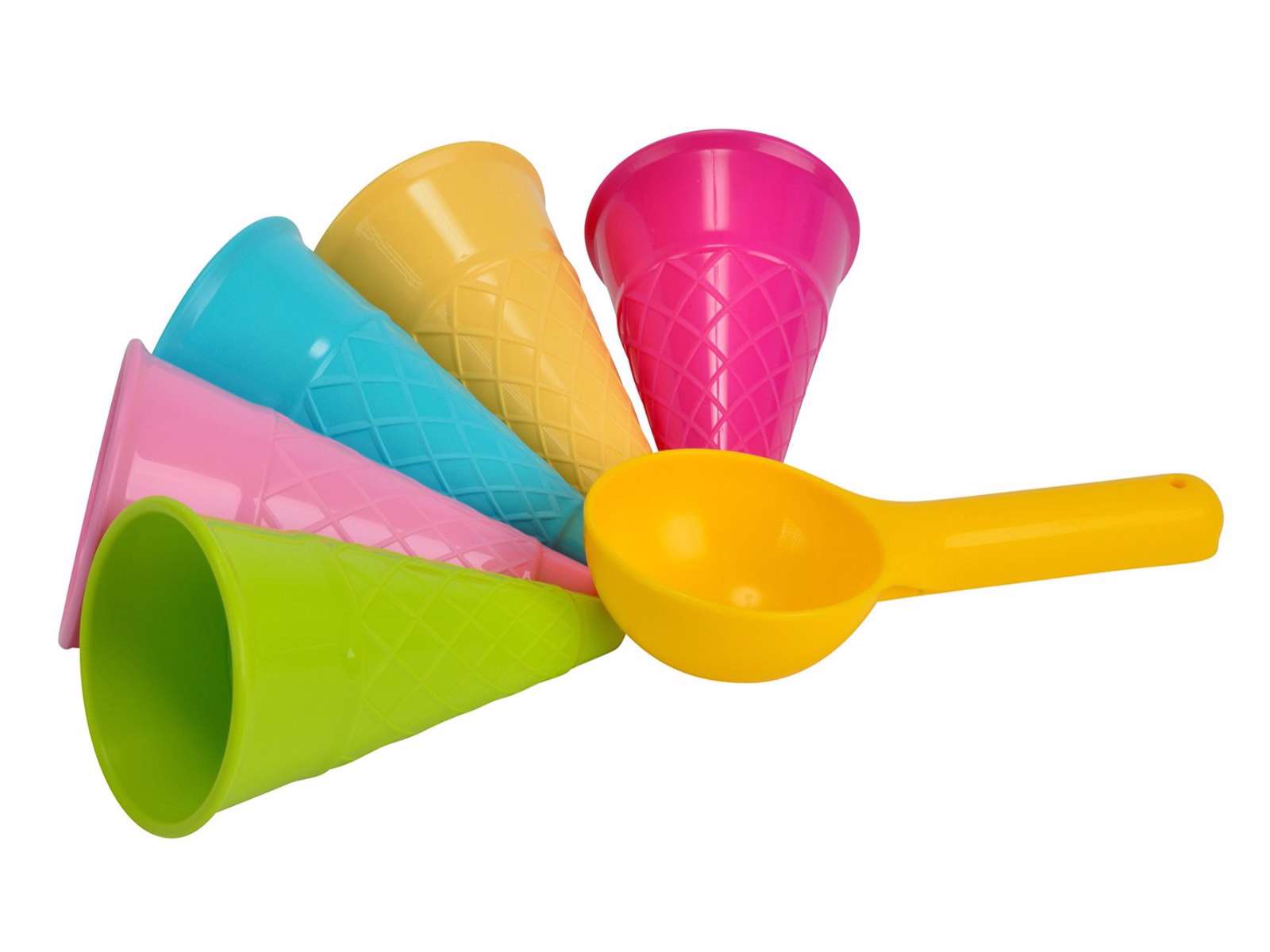 Uanset om der er hjemme i sandkassen eller på stranden: Med disse sandforme kan børnene bygge deres helt egne kreationer. Med den store isske kan sandet skubbes ud i en kugleform og placeres i keglen/vaflen.