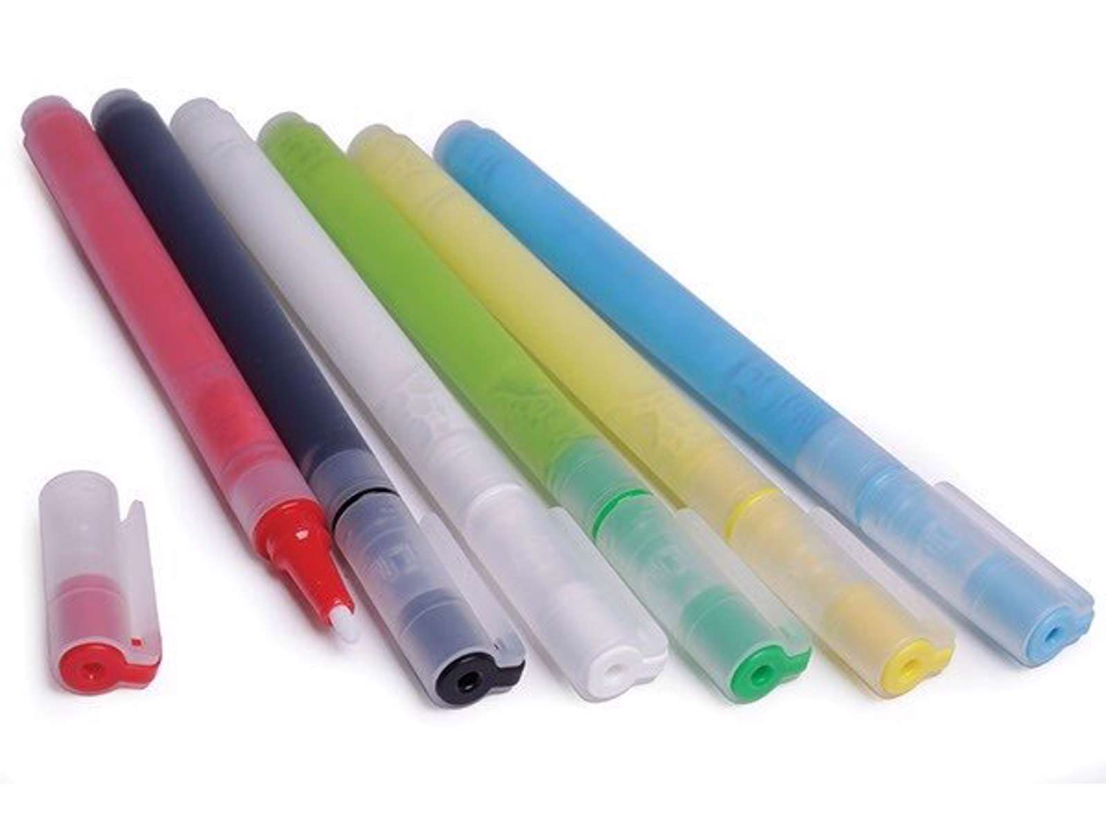 6 flotte sten tuscher med hoveder på 1 mm, til at lave de små detaljer. Sættet kommer med 6 tuscher i rød, sort, gul, blå, grøn og hvid.