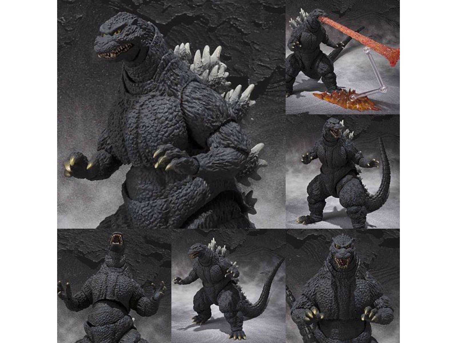Vildt sej Godzilla figur på 18 cm. Kommer med ekstra hænder og kan "spy ild". Godzilla as he appears after the final re-birth (post meltdown, Godzilla Junior revival) scene in the 1995 “Godzilla vs Destroyah” movie joins the high S.H.MonsterArts advanced monster action figure series with meticulously crafted detail and dynamic articulation. This deluxe kaiju action figure set features atomic breath effect and effect stand parts as well as interchangeable hand parts.