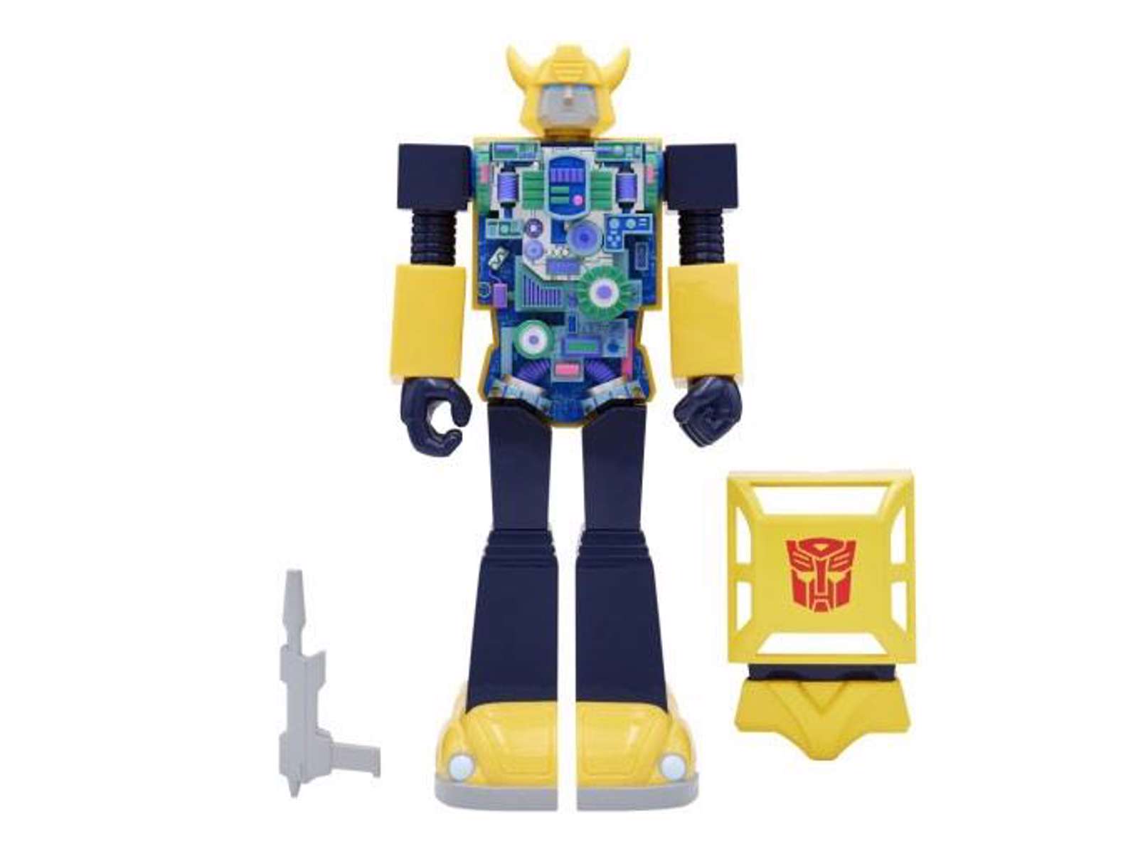The 11-inch Transformers Bumblebee Full Color Super Cyborg Vinyl Figure features poseable arms and legs, a blaster, and a removable chest plate to reveal his Cybertronian technology!