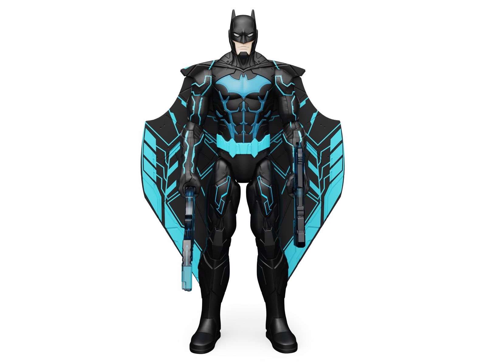 På bagsiden af figuren kan et håndtag trækkes ned, hvilket får Batmans vinger til at folde sig ud.