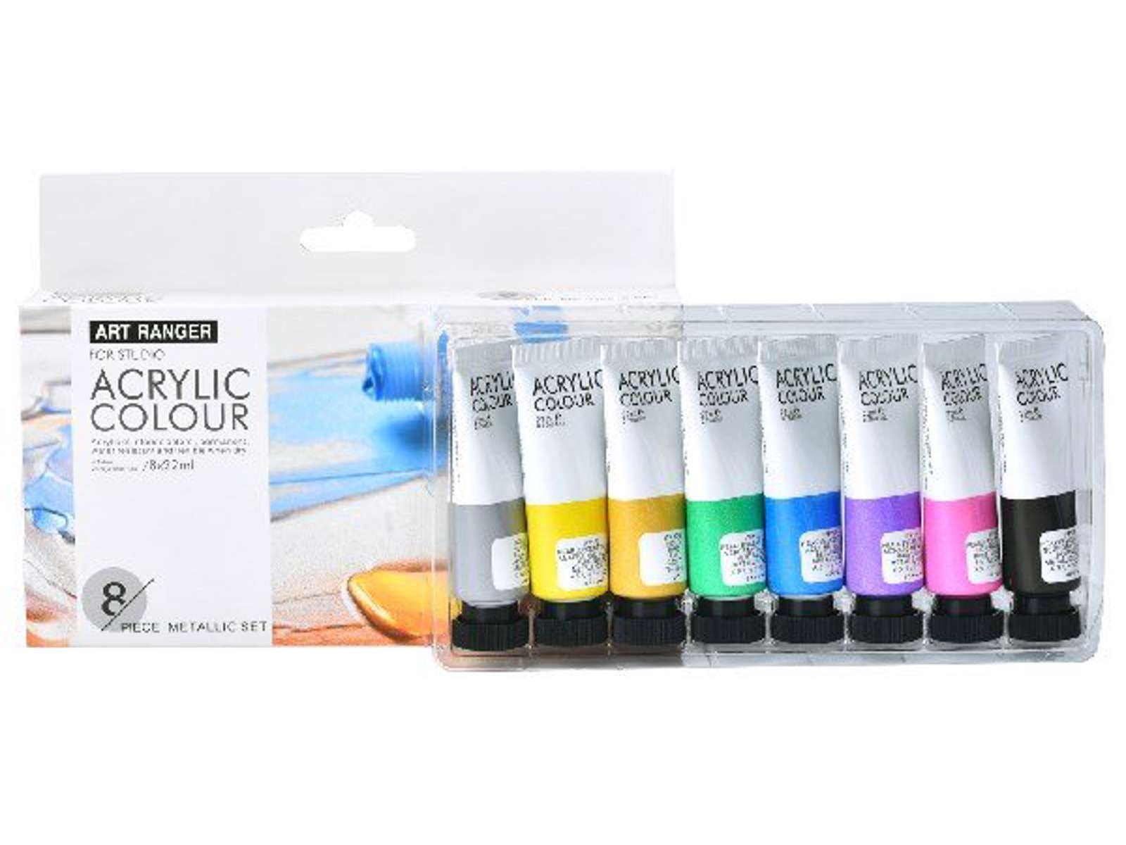 Her får du 8 tuber akrylmaling i metallic farver.   Acryl maling er velegnet til lærred, maleplader med m.m. Alle farver kan bruges og blandes med hinanden.