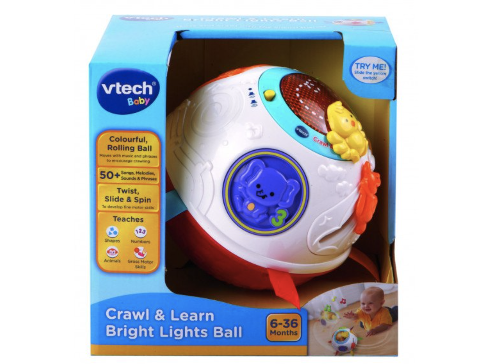 Denne kravle- og lærebold fra Vtech er perfekt, til barnet som mangler noget at kigge på når han/hun ligger på maven eller til barnet som så små er ved at lære at kravle.