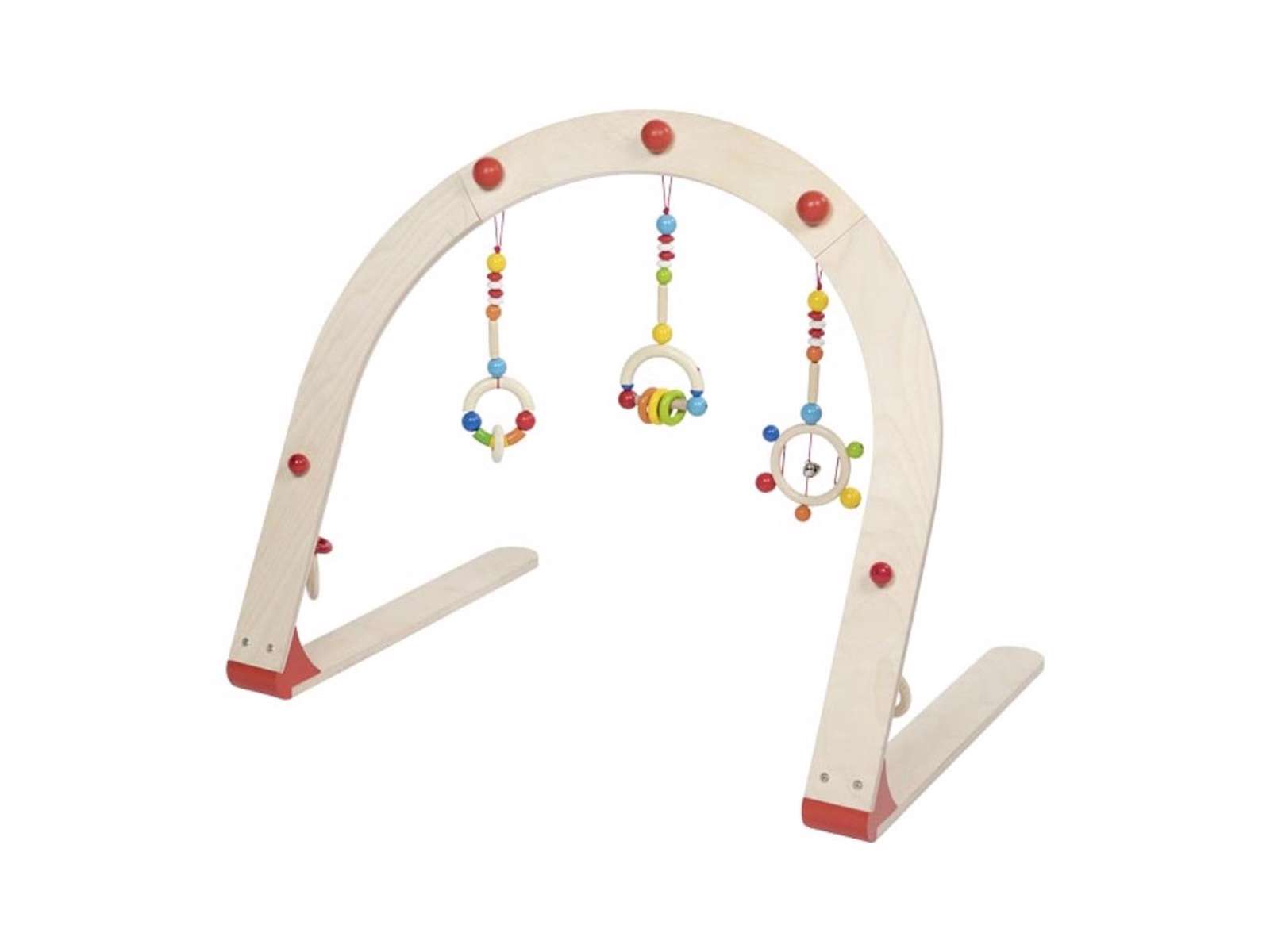 Flot Baby Gym med 3 forskellige aktivitets ophæng på en træbue. Buen måler 67 x 50 x 57,1 cm.