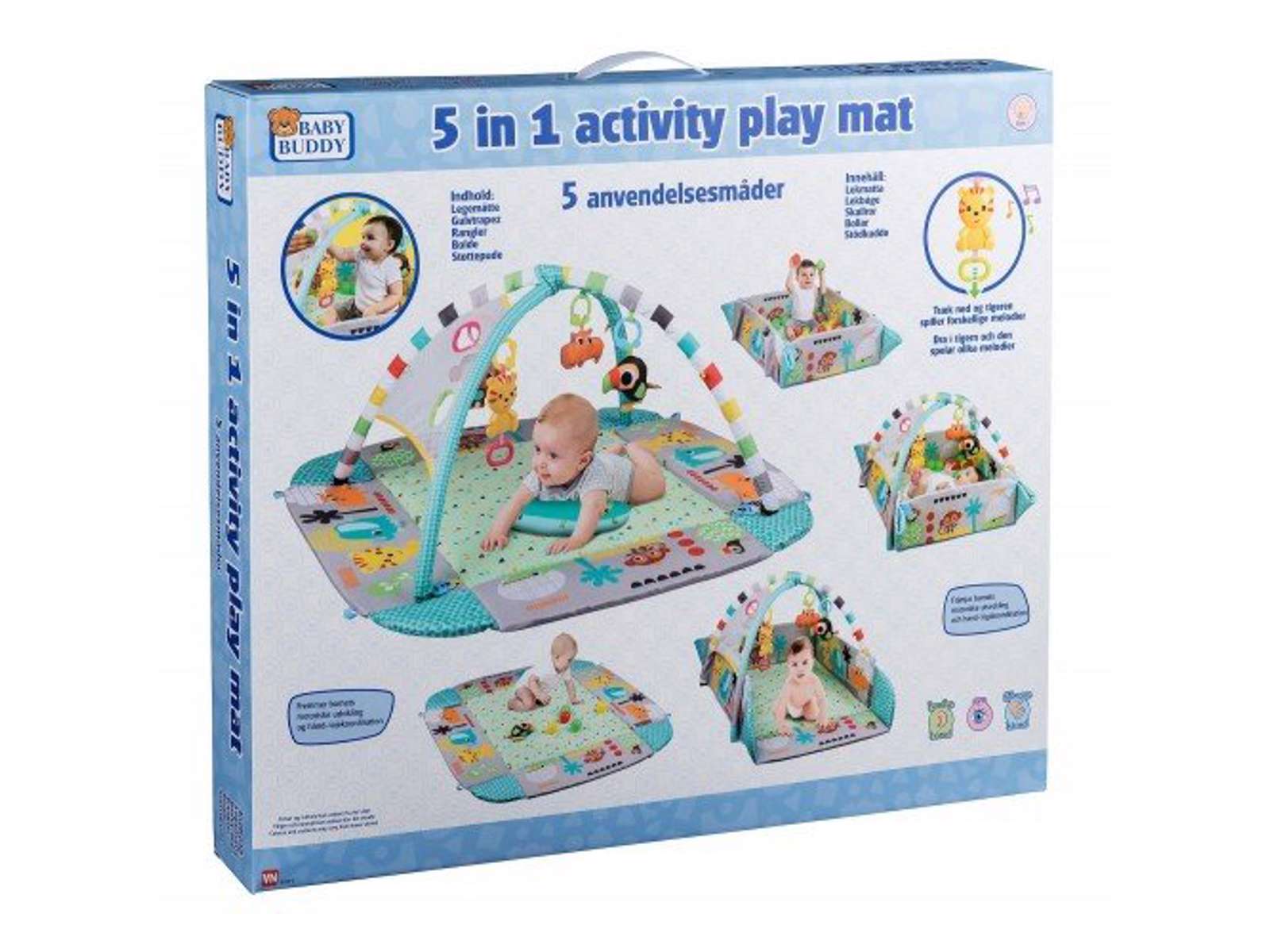 Indeholder legekugler, støttepude, rangler og en legetøjstiger som spiller musik.