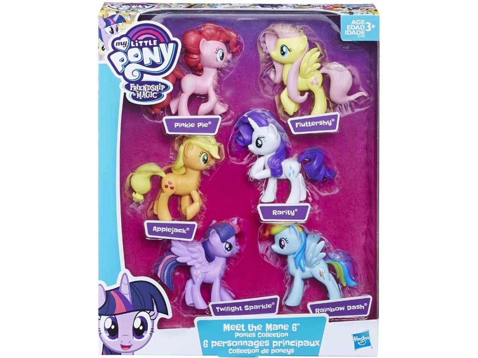 Nu kan du få de 6 hovedkarakterer fra My Little Pony tv serien. Sættet kommer med Pinkie Pie, Fluttershy, Applejack, Rarity, Twilight Sparkle og Rainbow Dash. Hver figur måler ca 9 cm, og kan ikke bevæges så selv de helt små kan være med. Sættet er lavet af Hasbro og er anbefalet fra 3 år.