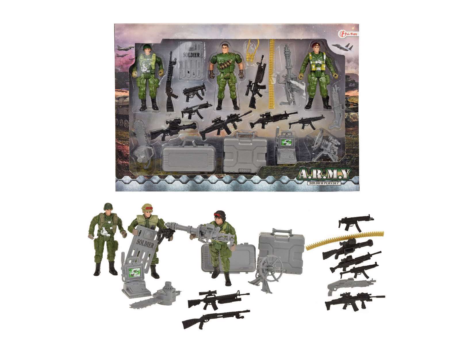 I dette militær legesæt får du 3 soldater og en masse tilbehør.