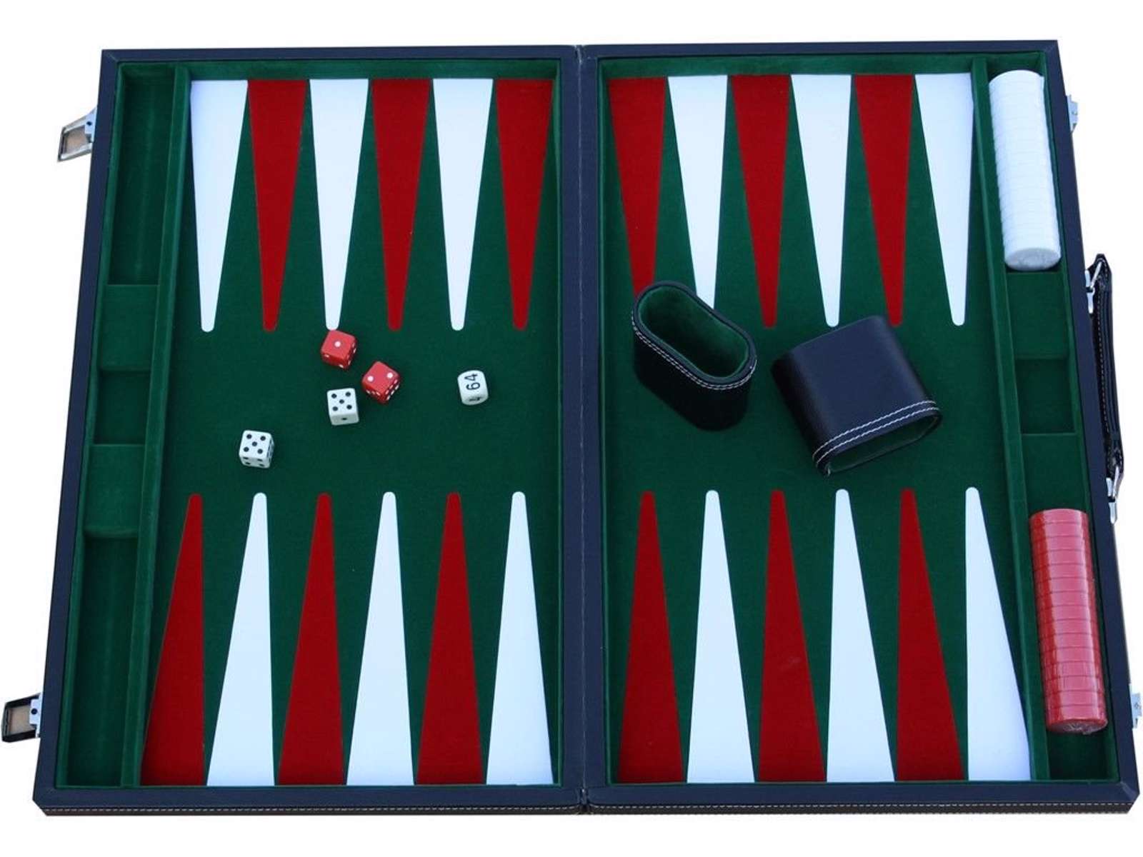 Denne backgammon kuffert er lavet af vinyl-læder, som er foret med grønt filt og har røde og hvide felter.