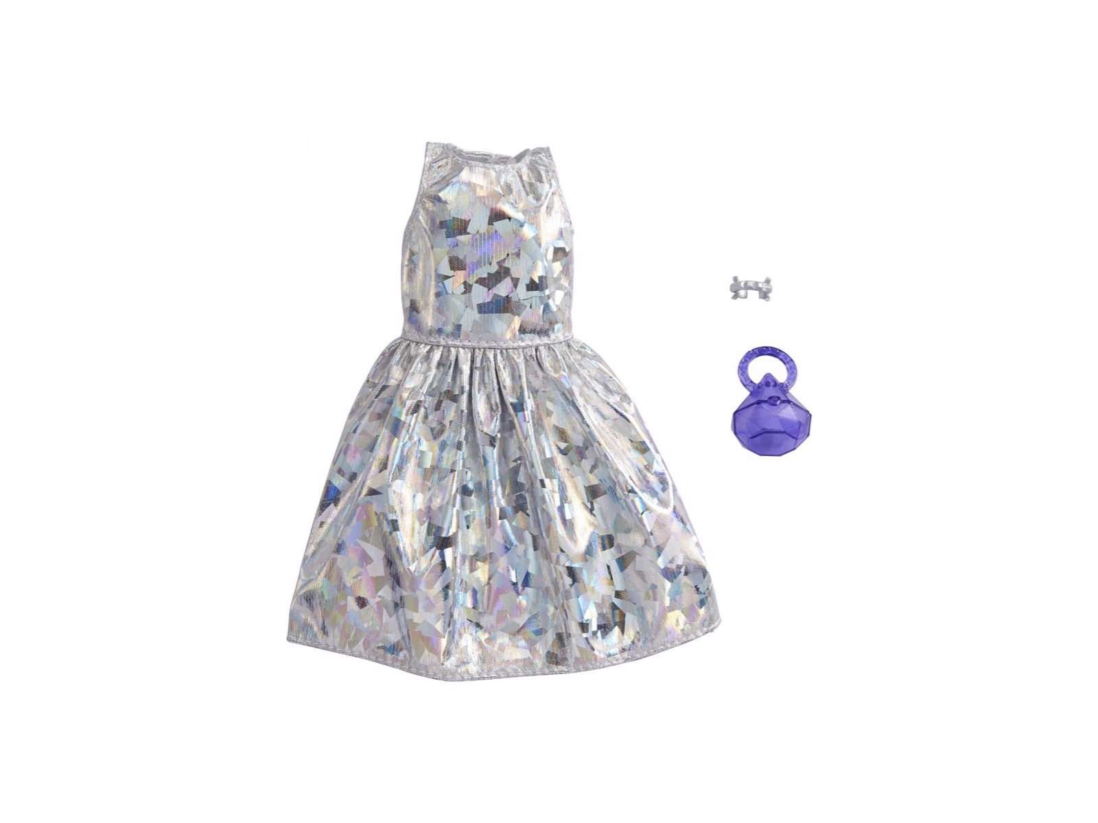 Sættet består af en super fin festkjole i sølv, med tilhørende armbånd og taske.