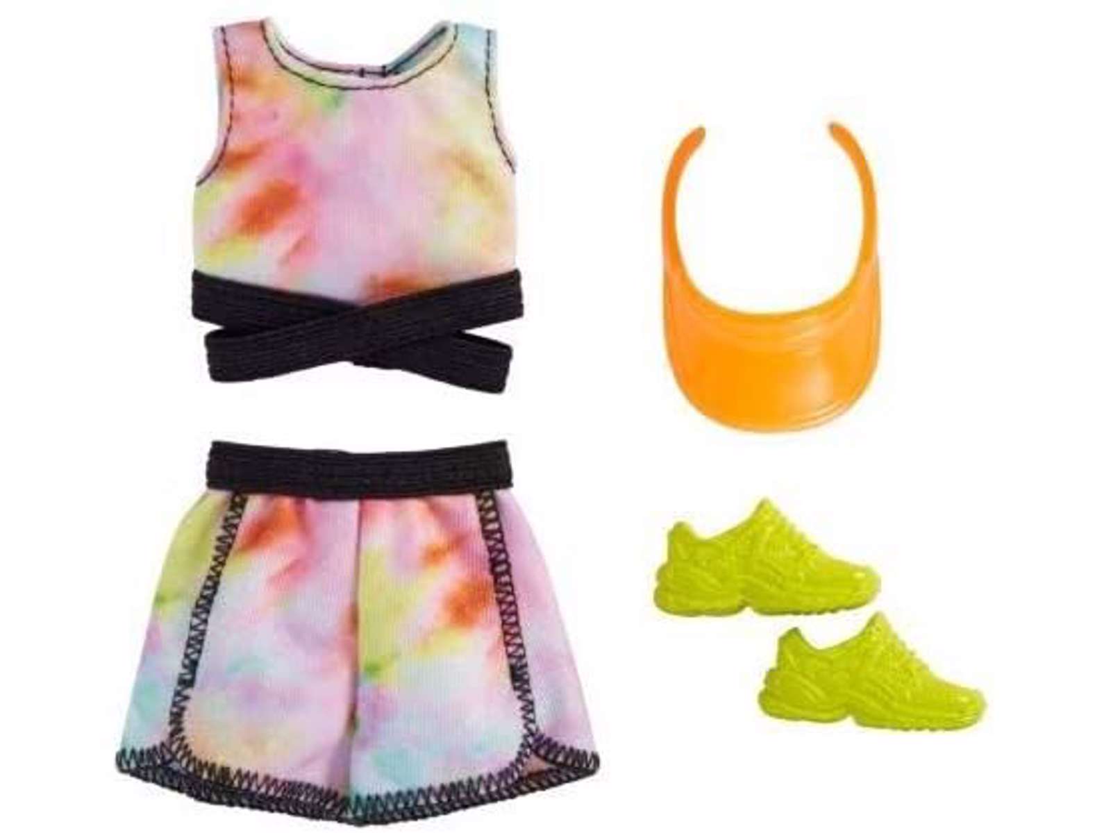 Sportytøj til Barbie. Sættet består af et par shorts med top, samt gummisko og en skyggehat.