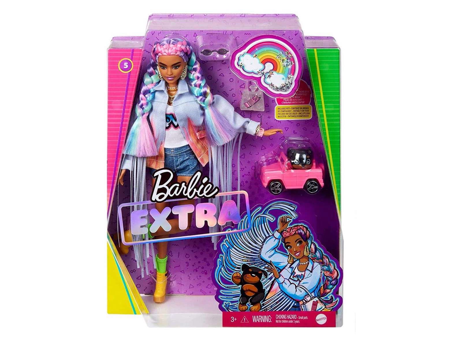 Denne Barbies frisure er stylet med regnbuefarvet hår i 2 store fletninger. Hendes look er sjovt og legende og viser hendes selvsikre stil med en grafisk tee, denimshorts med rigtige lommer og en denimjakke med flammeprint og lange frynser på armene.