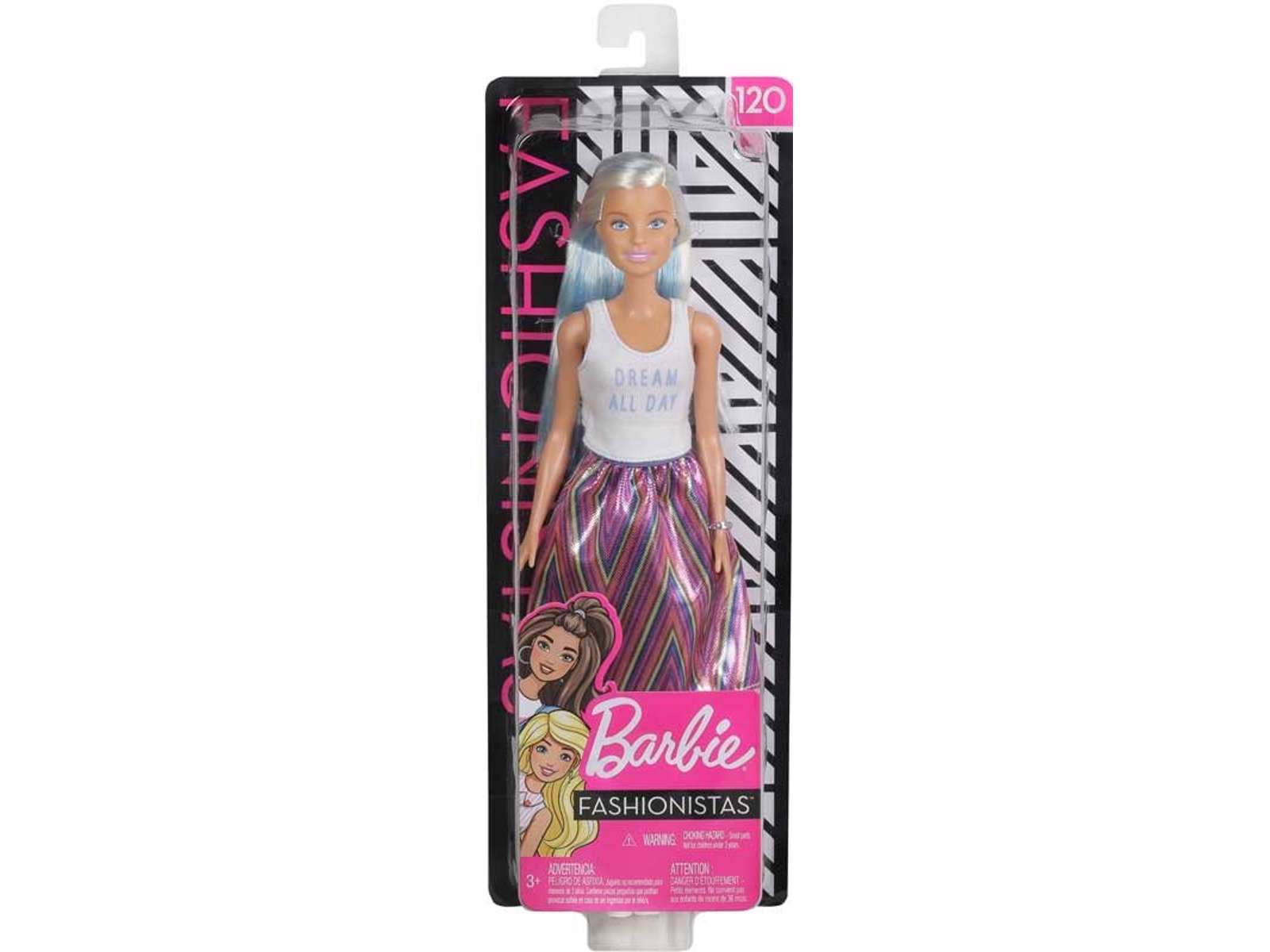Fashionistas er Barbies serie af dukker, der nu kommer i alle størrelser og former. Som altid har de alle flot tøj på. Barbie Fashionistas 120 - Barbie med flot glitternederdel der er stribet i alle regnbuens farver og "Dream alll day" top. Hendes lange hår er flot platin blond med blå striber.. Anbefalet alder fra 3 år.