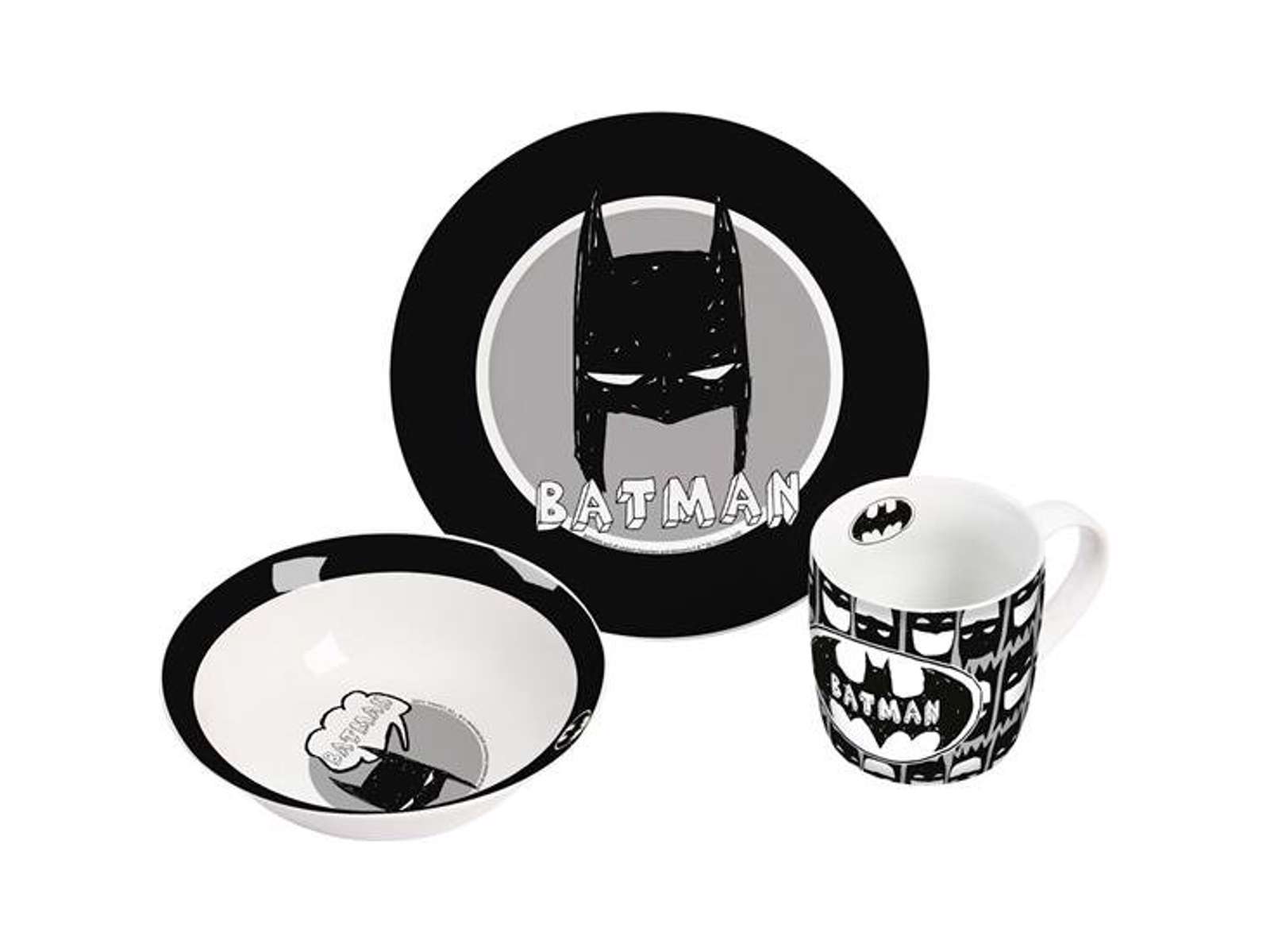 Dette Batman morgenmadssæt med Caped Crusader indeholder 1 Batman Krus (kapacitet: 0,250 liter), 1 Batman Skål (diameter: 15 cm) og 1 Batman Tallerken (diameter: 19 cm).