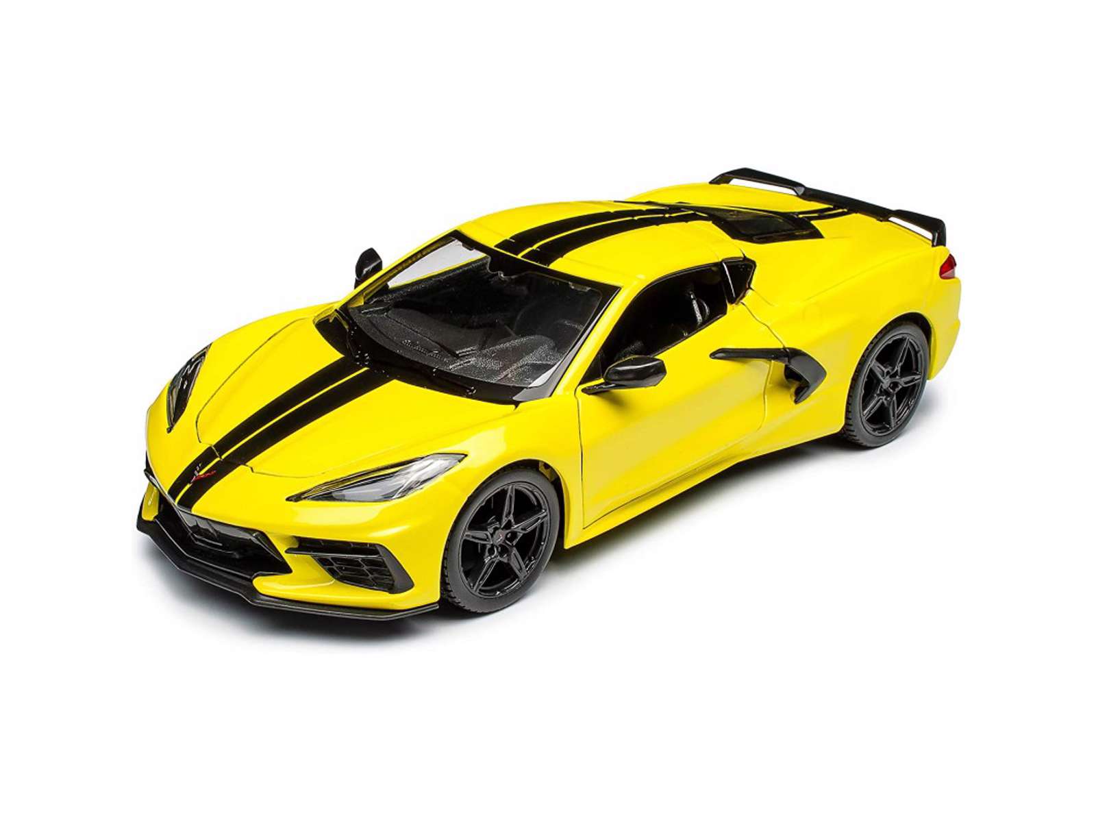 Flot Maisto modelbil af en Chevrolet Corvette C8 fra 2020. Bilen er lavet i metal og er lakeret i en flot gul farve med sporty sorte striber. Denne model af den ikoniske Chevrolet Corvette er et musthave for både små og store bil-fans!