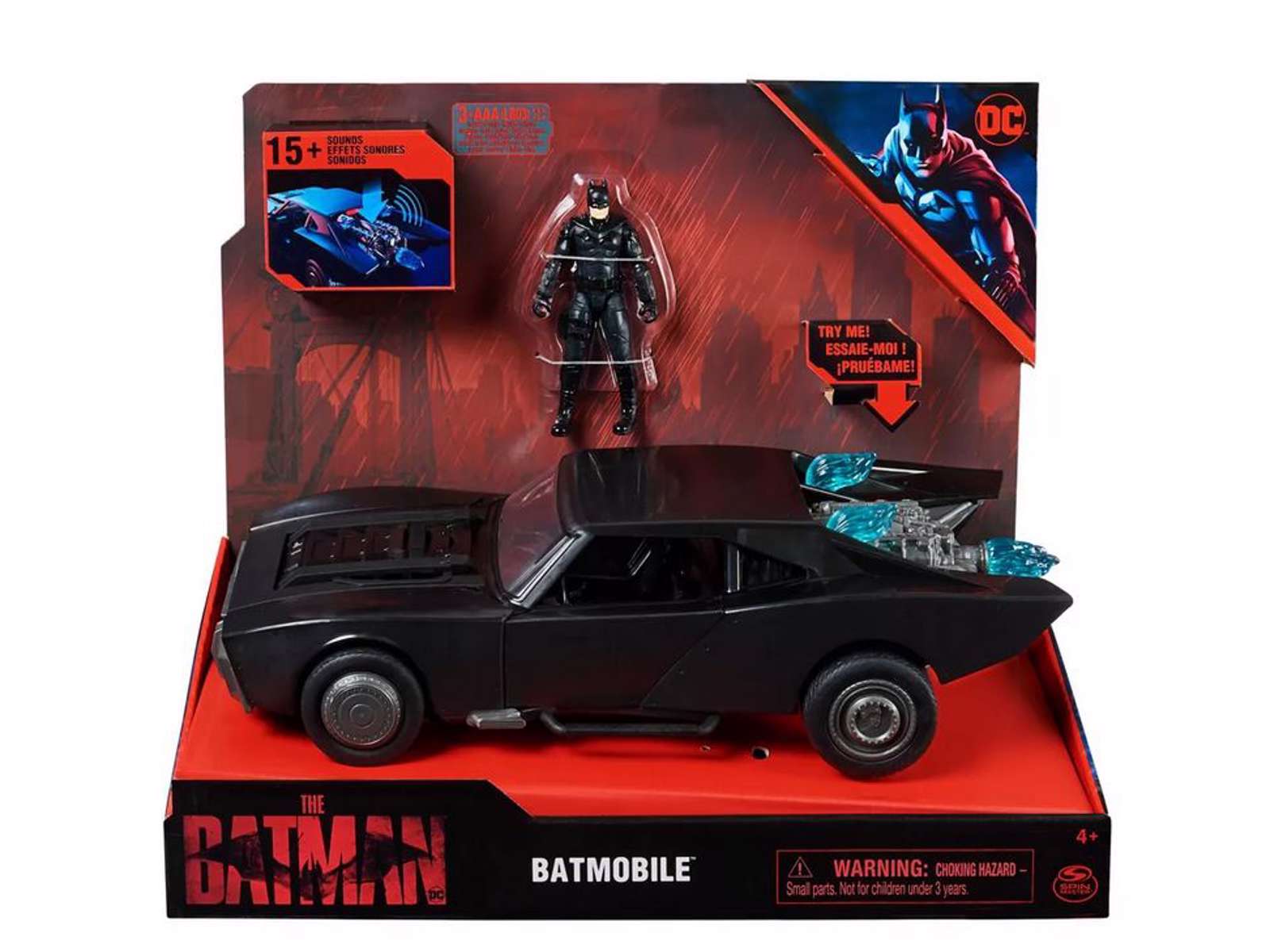 Hold gaderne i Gotham City sikre med Batman Batmobile! Dette slanke Batman-køretøj har LED-motorlys, fantastiske forlygter og undervognens resterende glød! Den detaljerede dekoration og skulptur i filmstil bringer Batmobilen til live. Tryk ned på motoren for at aktivere over 15 nøjagtige motorlyde ligesom i Batman-filmen! Indeholder 4-tommer Batman-figur med stofkappe, detaljeret skulptur og autentisk filmstyling. Med 11 artikulationspunkter er det nemt at placere Batman-actionfiguren i en række dynamiske positurer! Batman legesæt er en fantastisk Batman legetøjsgave til børn. Batman superheltelegetøj er den ultimative jule- og fødselsdagsgave til drenge og piger.