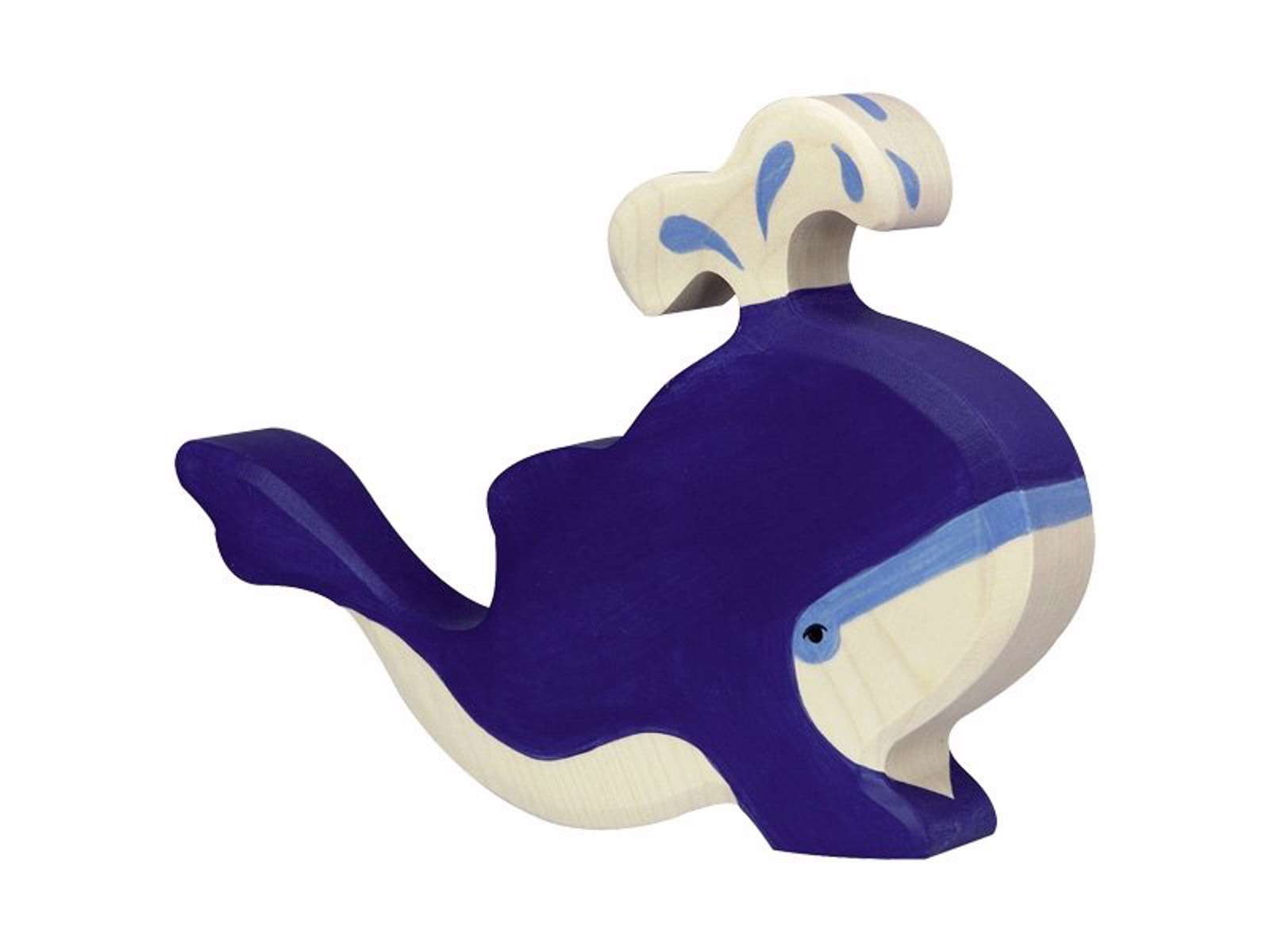 Sød håndlavet og håndmalet blåhval af træ. Hvalen kommer fra Holztiger og er ca. 13 cm høj. Anbefales fra 3 år.