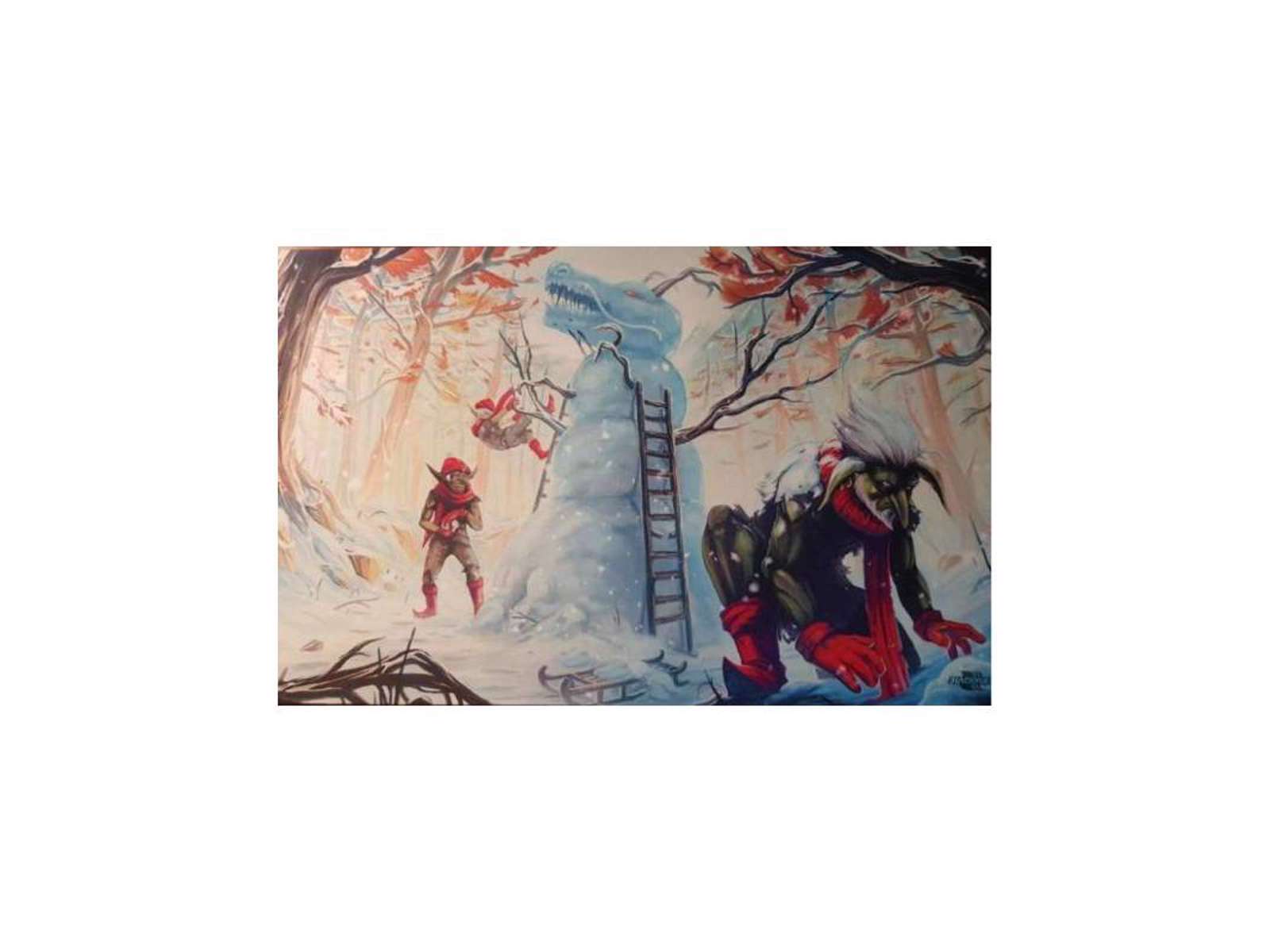 Flot design med julede gobliner, der bygger 'snemand' på forsiden.