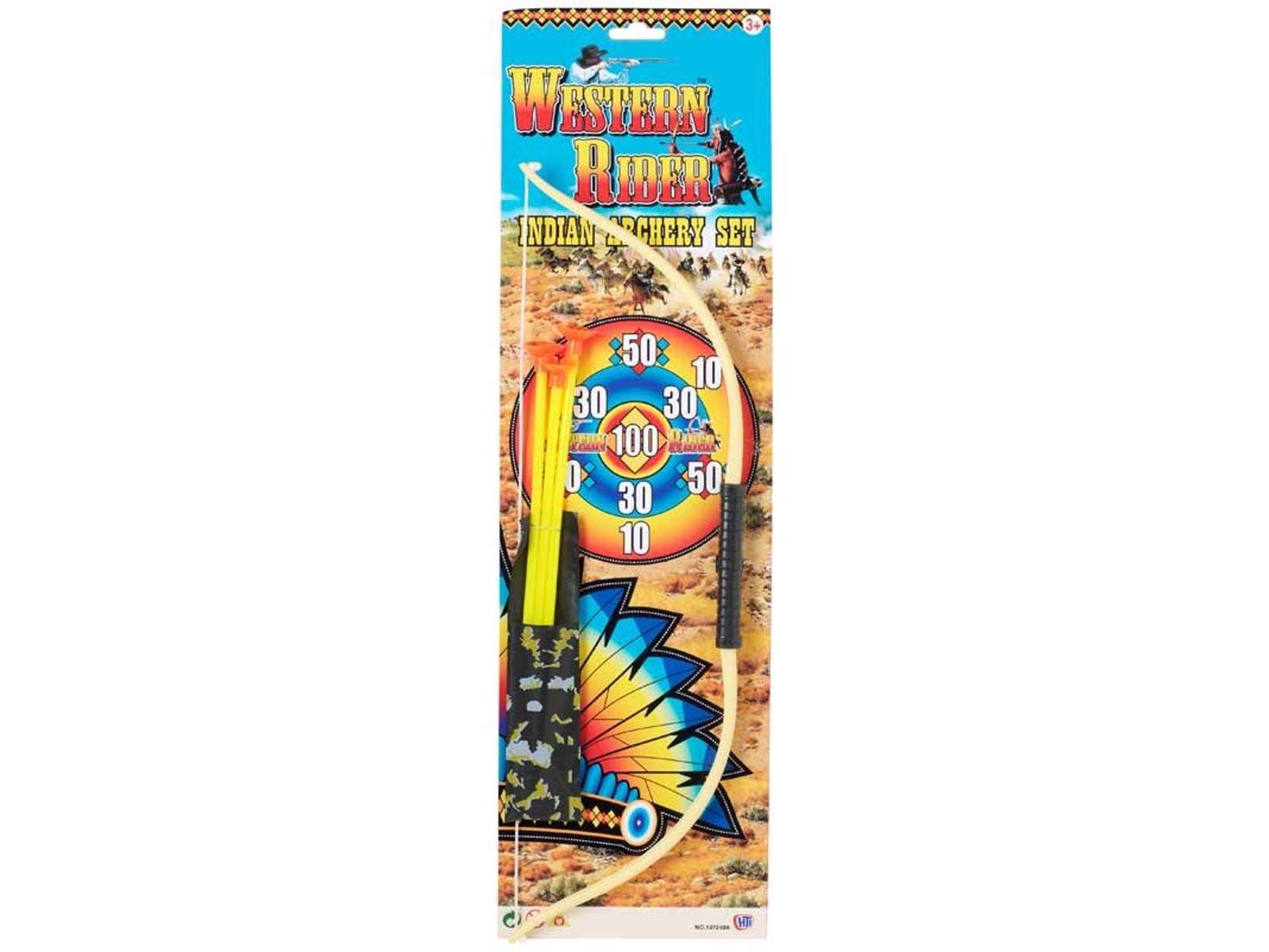 Bue- og pilesæt der indeholder en bue, 3 pile med sugekopper og en skydeskive.