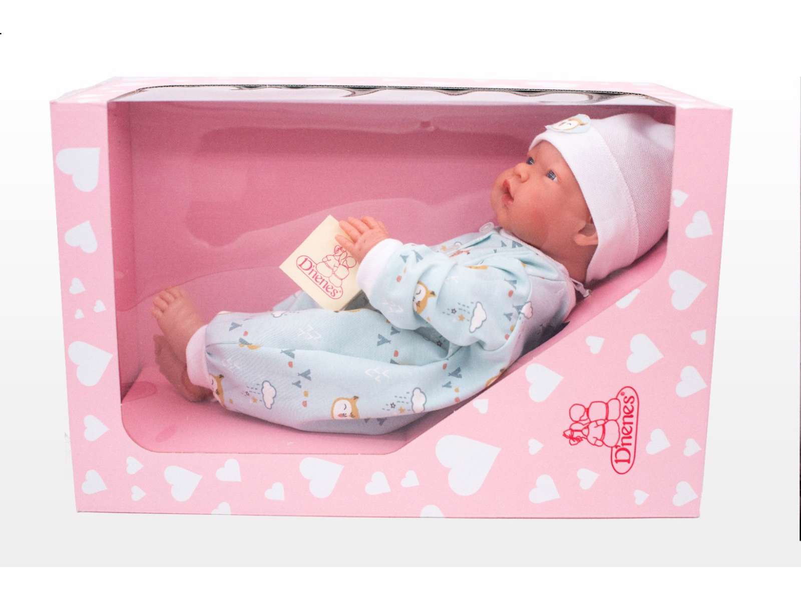 Den smukkeste Carmen Gonzalez babydukke fra D´nenes Diseno med et superrealistisk ansigtsudtryk er klar til at komme med hjem til en lille pige eller dreng! Dukken er 48 cm. lang, uden hår og er iført en fin lyseblå sparkedragt med motiver af skovens dyr, samt en hvid babyhue.