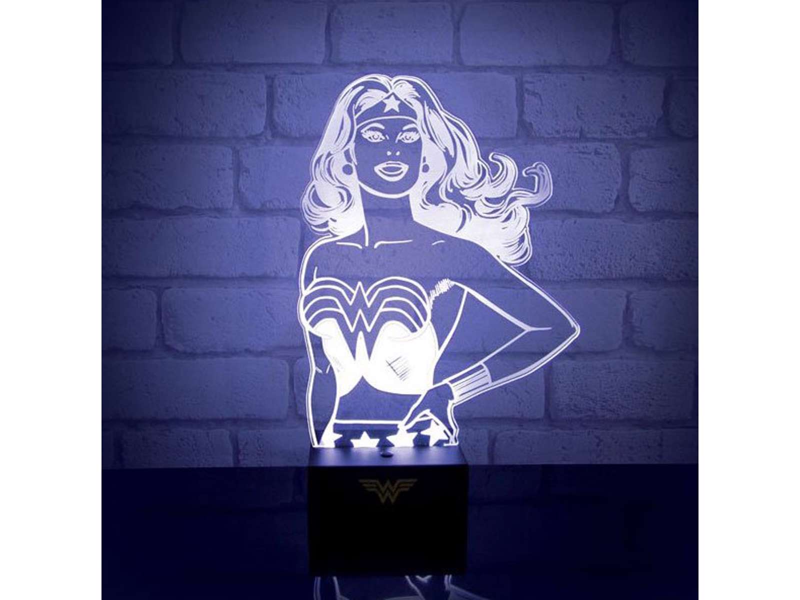 Superfed lampe med Wonder Woman. Det måler 24 x 15 cm. Officially licensed DC Comics laser etched acrylic Light, perfect for a desk or bedside table. Comes with USB adaptor. (also works with batteries - not included)
