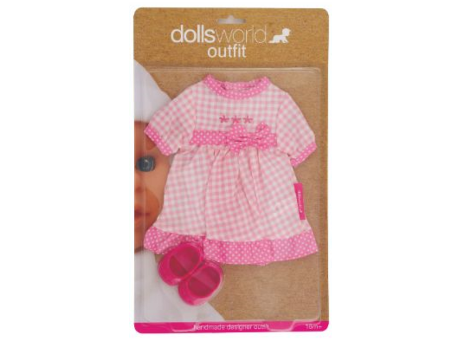 Sød kjole der passer til dukker op til 36 cm lange. Dette sæt dukketøj er en fin lyserød kjole, med hvide tern og sløjfe på maven.