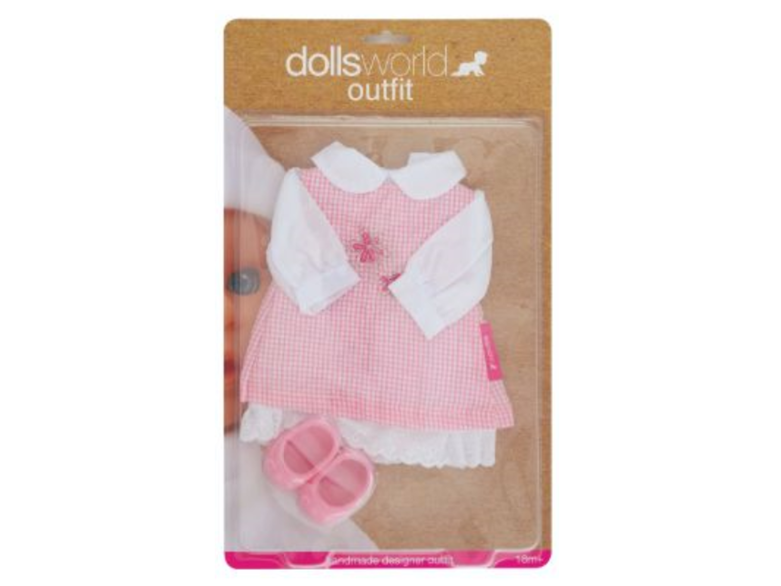 Sød kjole der passer til dukker op til 36 cm lange. Dette sæt dukketøj er en fin lyserød kjole, med hvide ærmer og krave og broderede blomster på maven.