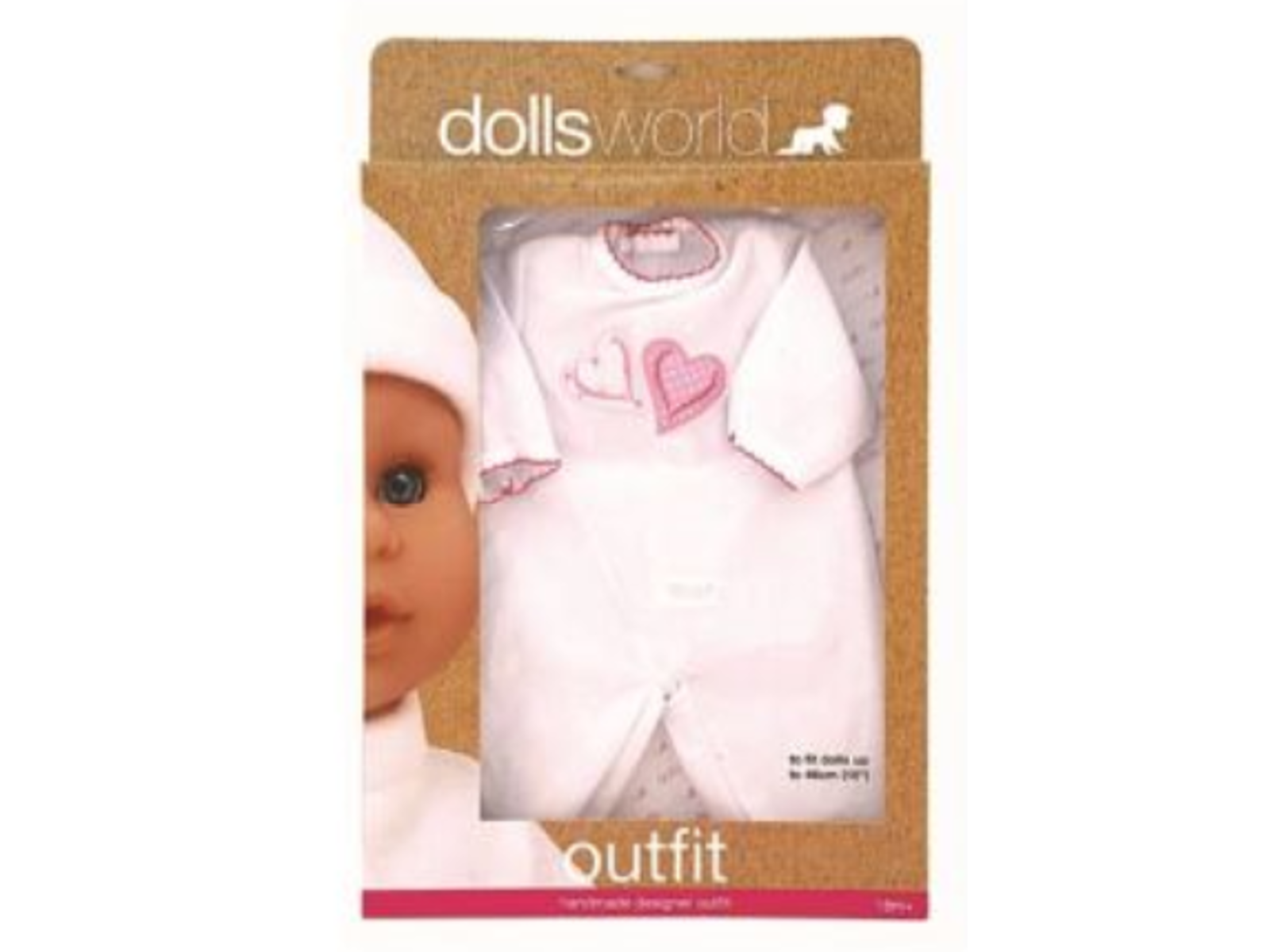 Dette sæt dukketøj er en fin hvid sparkedragt, med to søde hjerter på maven.