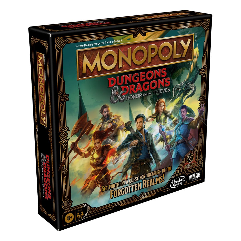 Adventure across a land of magic and monsters with the Monopoly Dungeons & Dragons: Honor Among Thieves game, inspired by the D&D movie! This immersive board game features key characters and locations from the film. Players can explore the Forgotten Realms as part of an intrepid adventuring party. Discover adventure around the Sword Coast and the perilous Underdark, seek out useful items and powerful spells, and collect treasure. But watch out for monsters, devious Red Wizards, and backstabbing rogues! The game ends when all locations have been secured. The player with the most gold wins! This D&D adventure game is for ages 8 and up, and it makes a great gift for fans of Dungeons & Dragons and the Monopoly game.