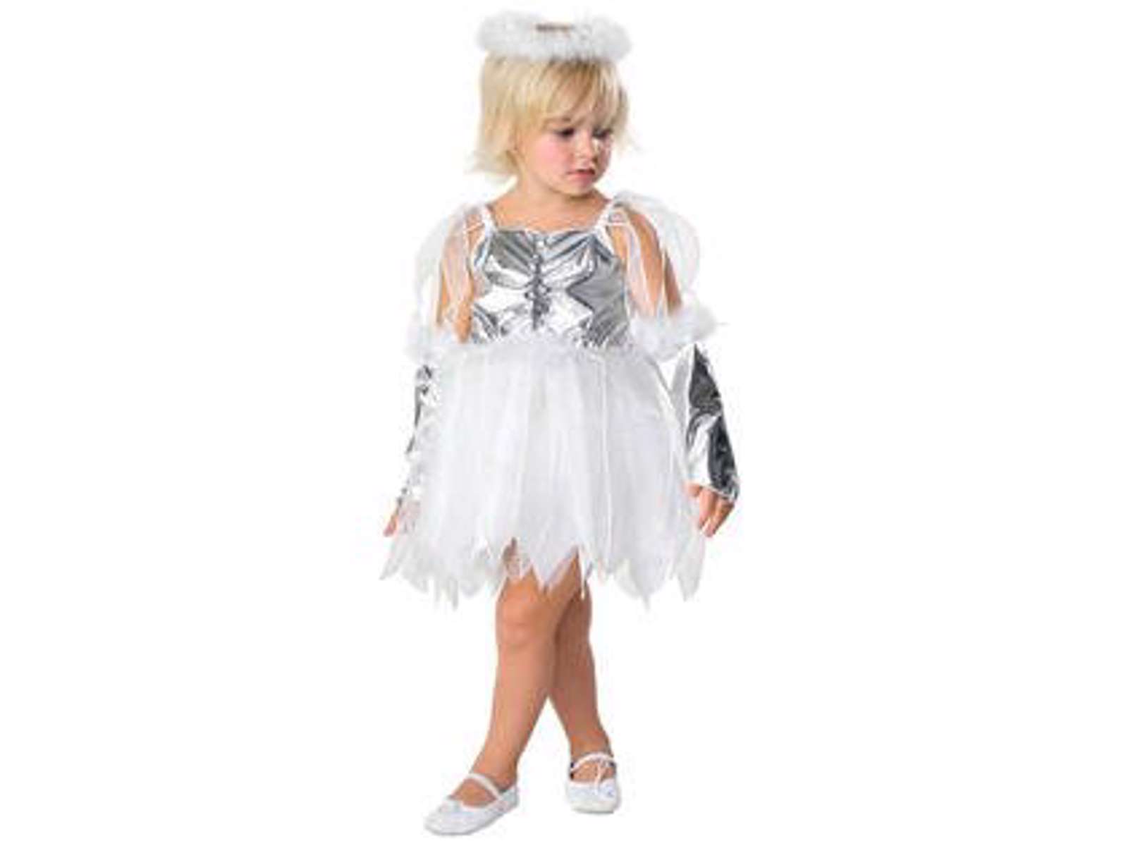 Der medfølger vinger, som sættes på med velkro, samt handsker og en glorie.
