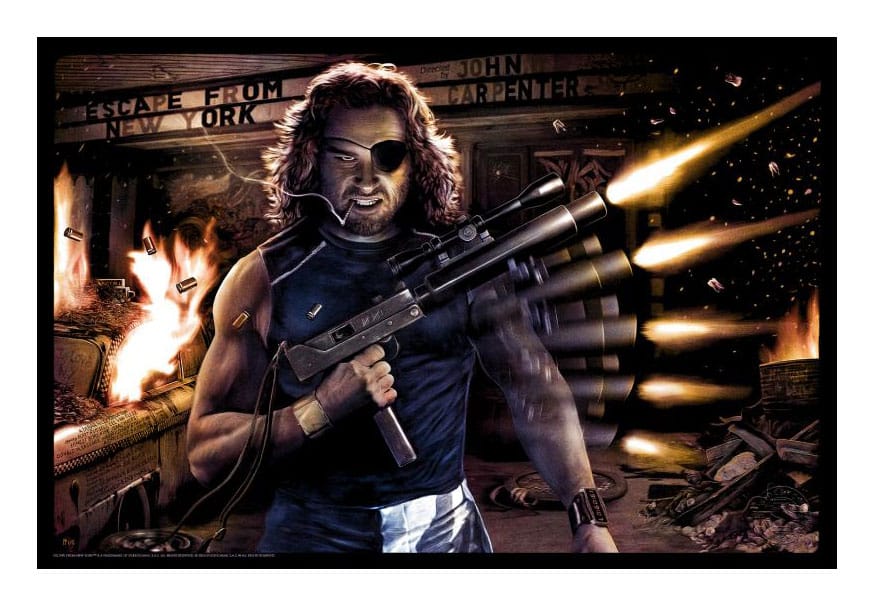 The rules are simple: Once you go in, you don't come out. The Escape From New York Fine Art Print crash-lands viewers right in the middle of the warzone with iconic antihero Snake Plissken as he attempts to rescue the President from the maximum-security prison of Manhattan. Standing in front of the Fox Theatre marquee, the former soldier fires off a few rounds from his weapon as Crazies emerge from the sewers below. Cabbie's taxi sits engulfed in flames while ash and debris litter the hazy air. Grime and graffiti cover every inch of this dystopian scene, with Plissken's life clock counting down every precious second left to complete the extraction from hell.