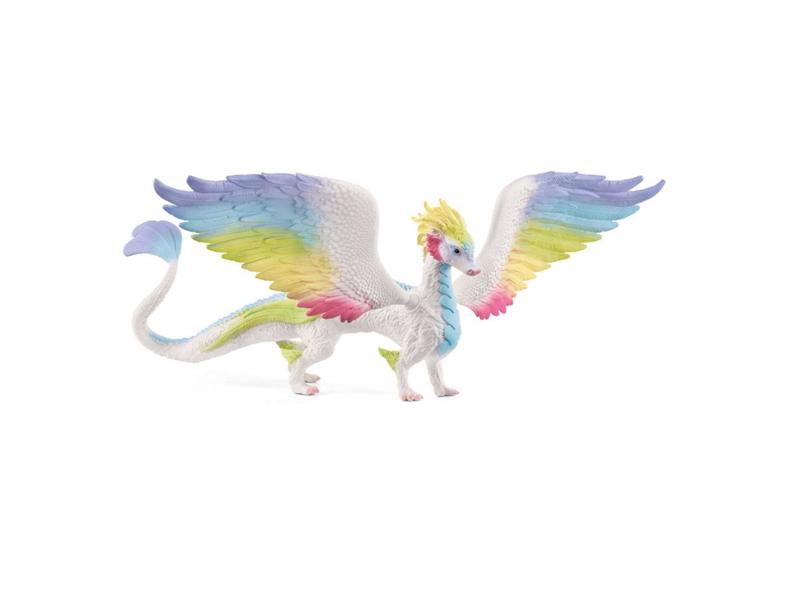 Den fantastisk regnbuefarvede drage fra Schleich Bayala har en fjerdragt, der reflekterer solen og fylder horisonten med alle sine farver!