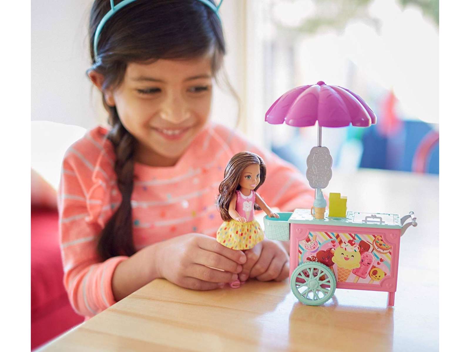 Barbie Club Chelsea isvogn sættet indeholder en dukke, en kat og en isvogn med tilbehør.
