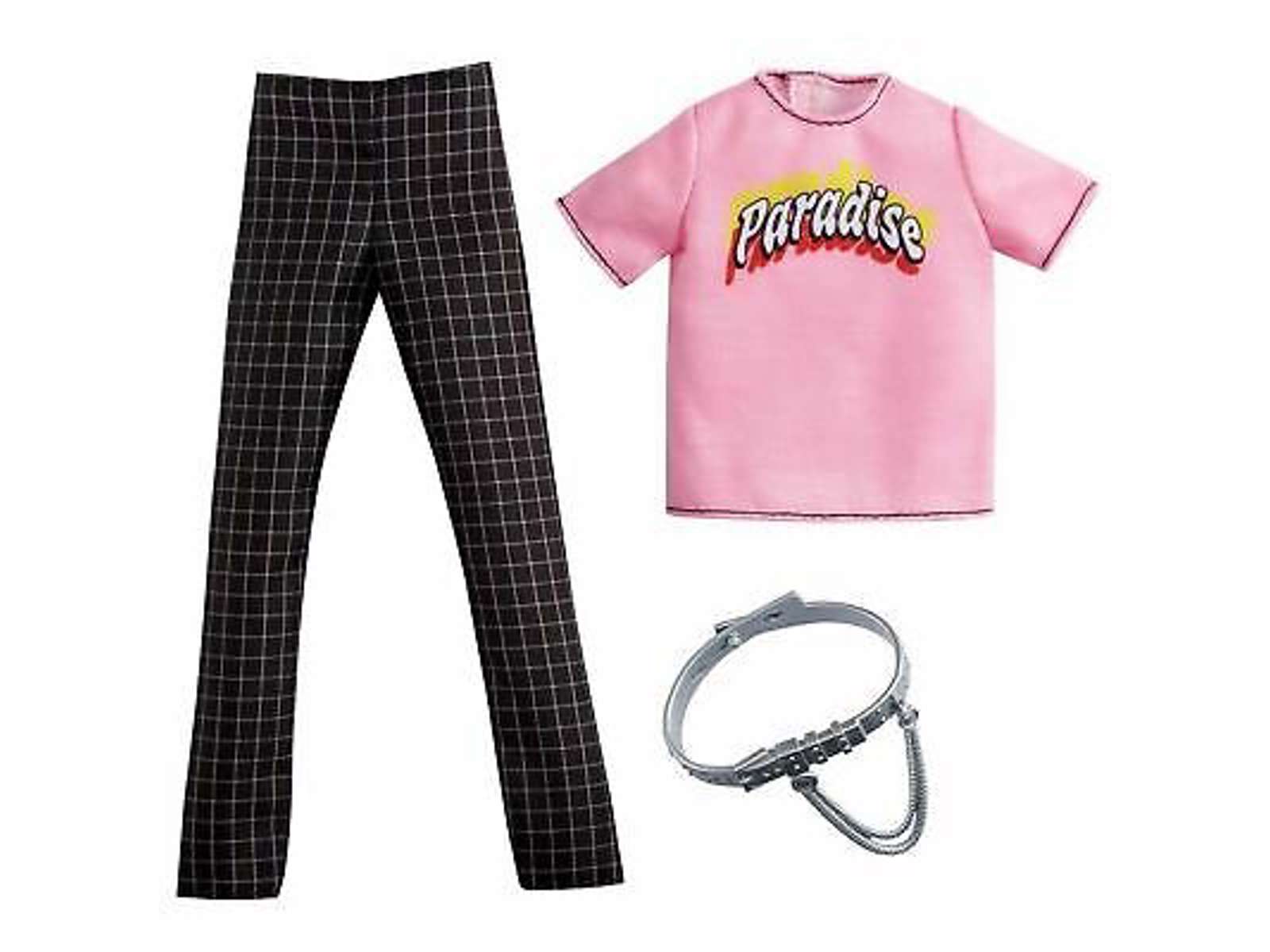 Smart sæt til Ken fra Barbie. Det kommer med ternede bukser, lyserød t-shirt og bælte. Anbefalet alder fra 3 år.