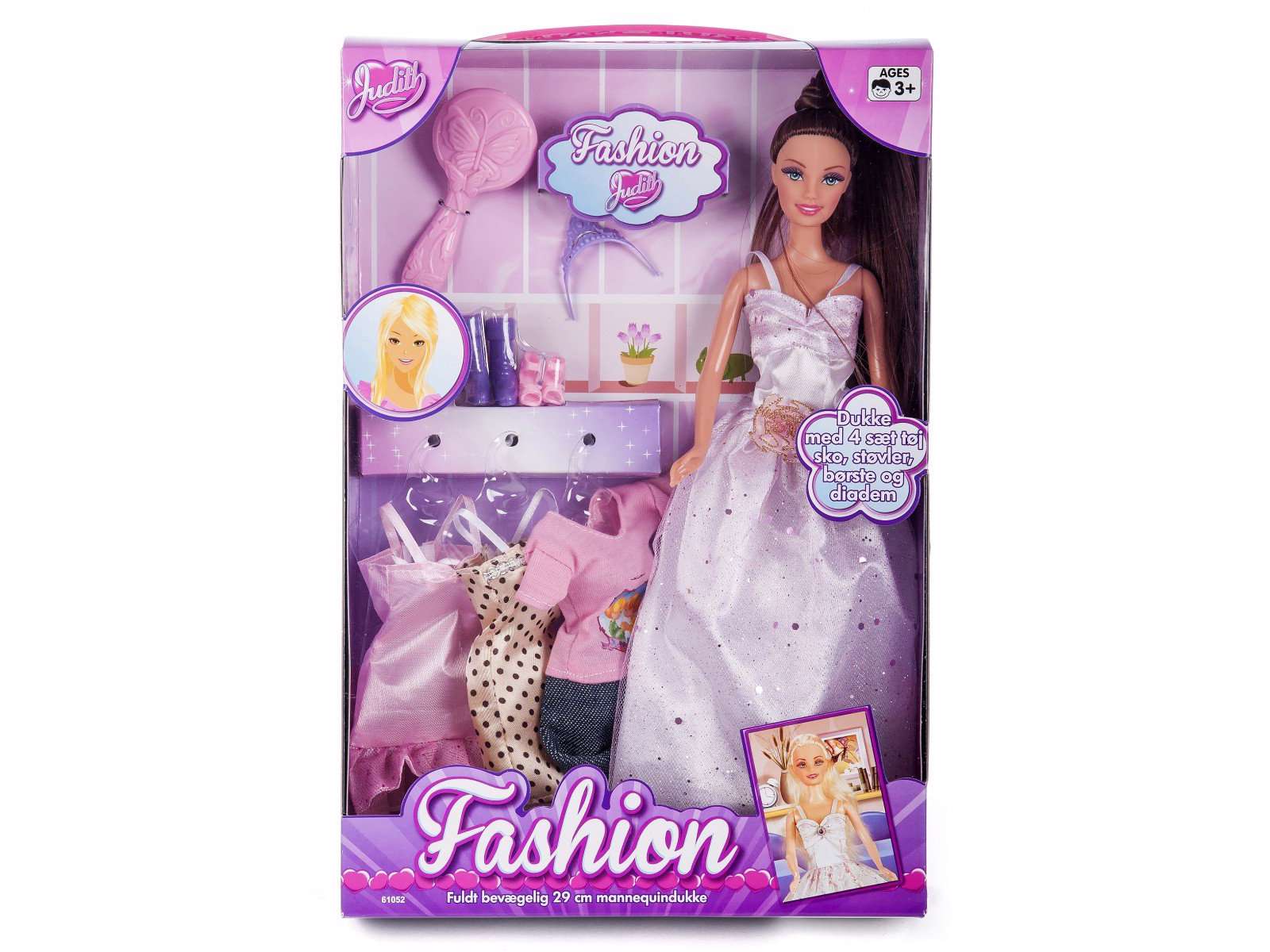 Judith fashion dukke sæt med 4 sæt tøj, støvler, sko, hårbørste og diadem. Judith måler 29 cm og er fuldt bevægelig. Anbefalet alder fra 3 år.
