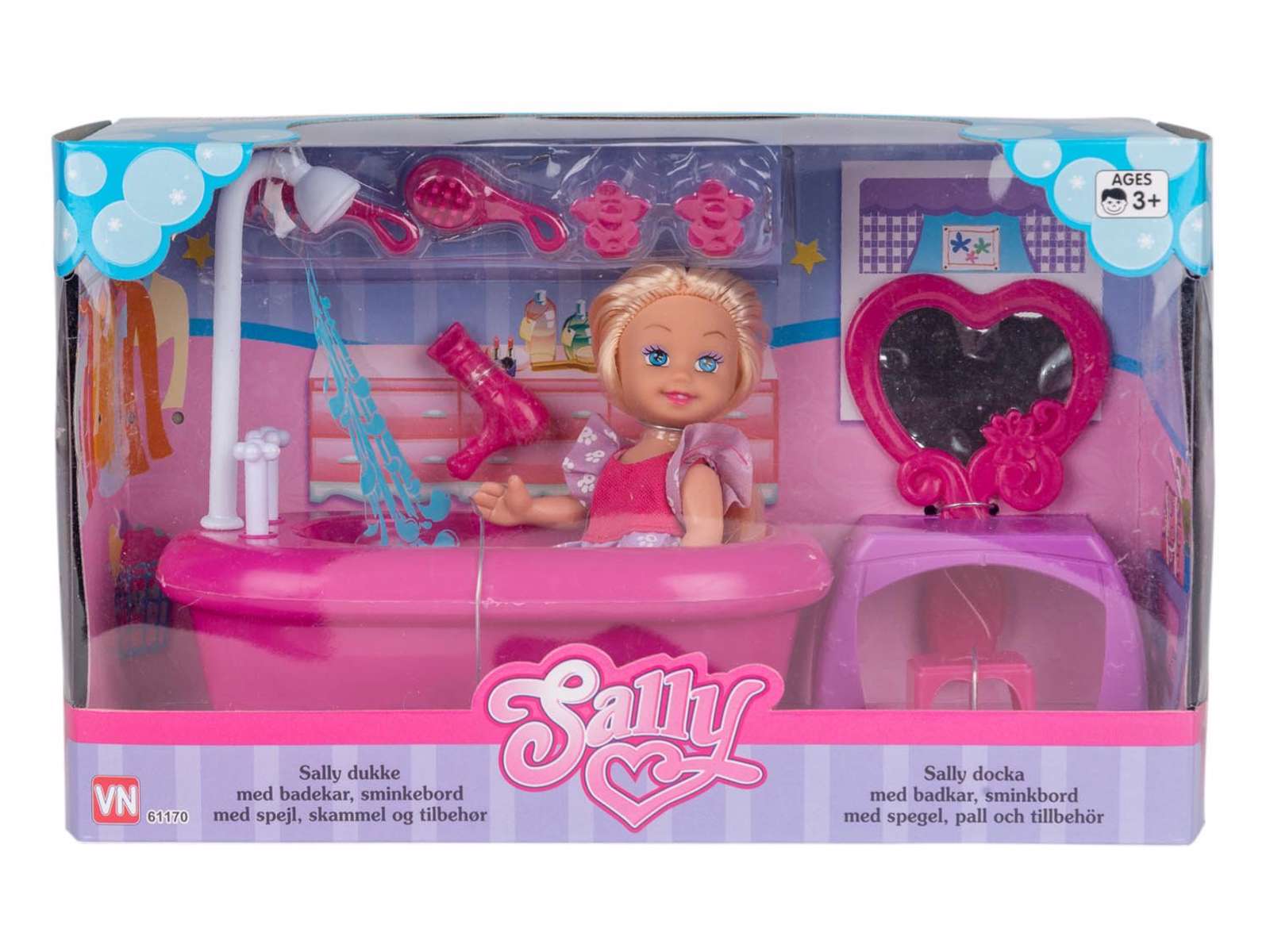 Sally dukke med badekar, skammel,sminkebord med spejl og tilbehør. Anbefales fra 3 år.