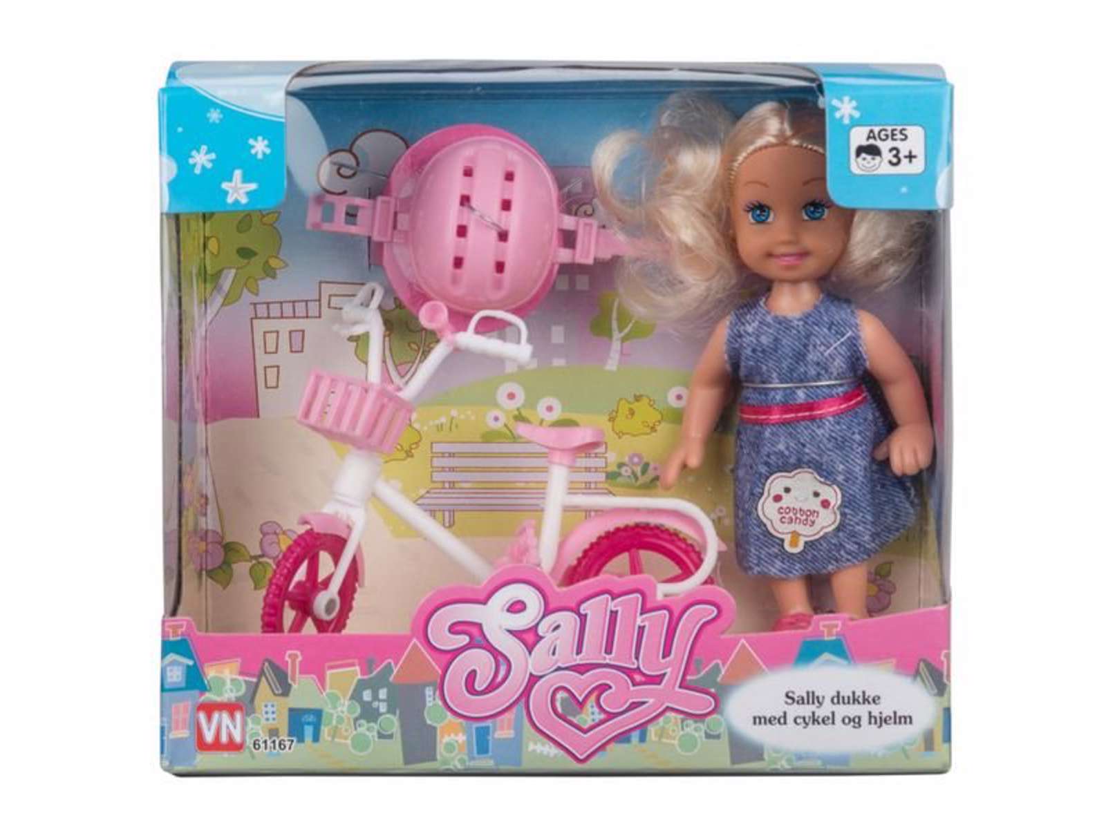 Pakken indeholder 1 Sally dukke, 1 sæt tøj/sko, 1 cykel og 1 cykelhjelm.