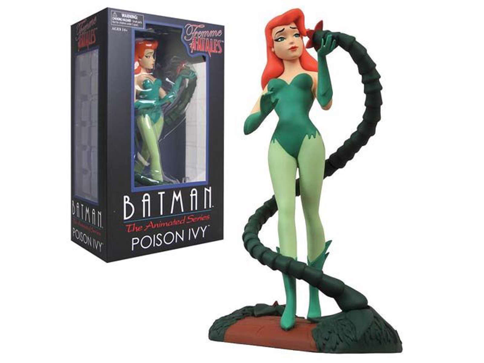 DST's line of Femme Fatales PVC statues based on the women of the DC Animated Universe continues with Poison Ivy! Based on her appearance in Batman: The Animated Series, this PVC statue of the plant-loving Pamela Isley stands 23 cm tall atop her diorama base, and depicts the villainous vixen visiting with a vine-like friend, perhaps discussing how best to entangle the Dark Knight. Packaged in a full-color box window box. Sculpted by Steve Varner Studios!