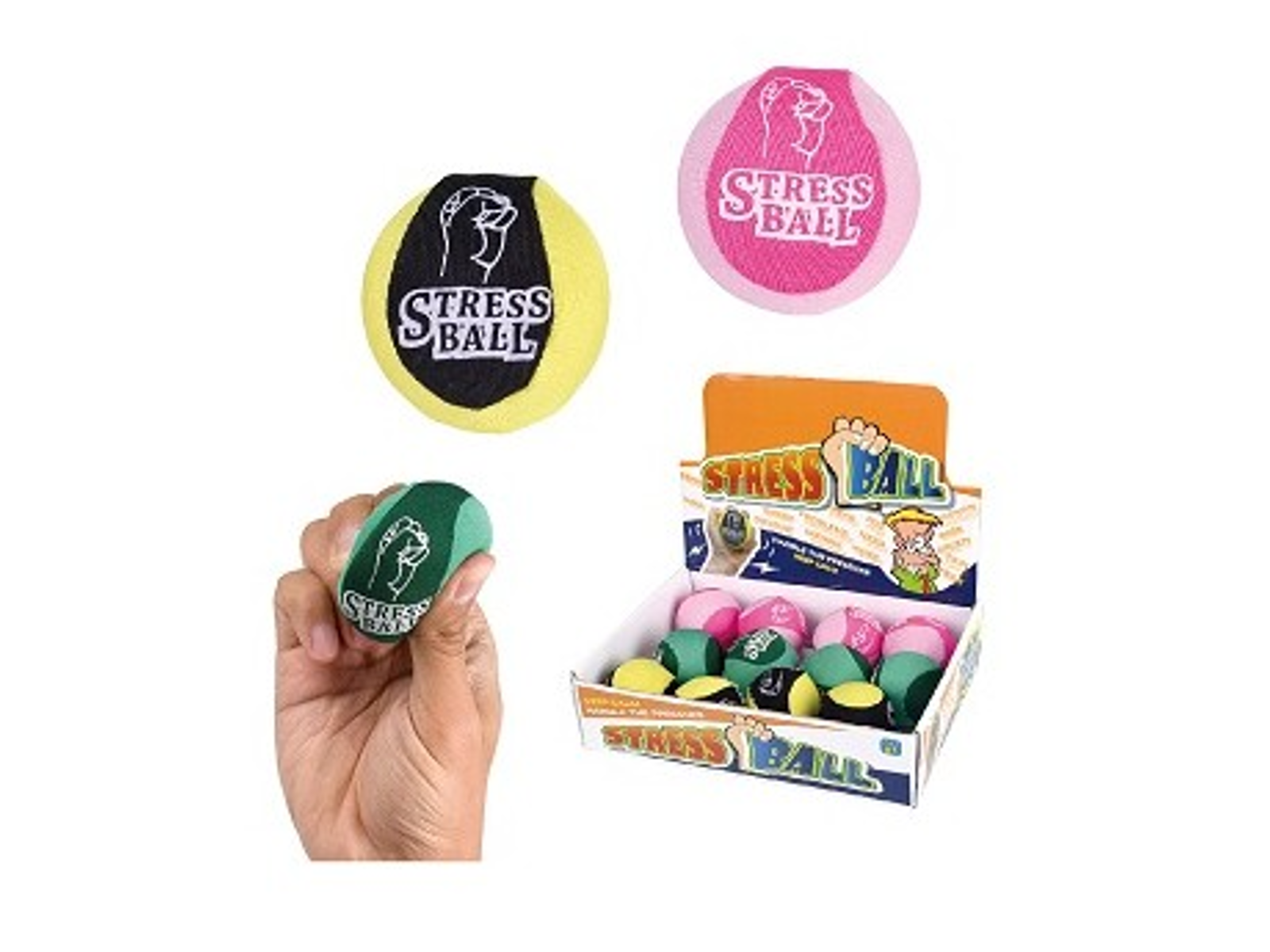 Fin lille stressbold med stof overflade. Bolden er 5 cm i diameter, og findes i 3 forskellige farver: Grøn, gul og lyserød. Kontakt butikken for lagerstatus hvis en bestemt farve ønskes.