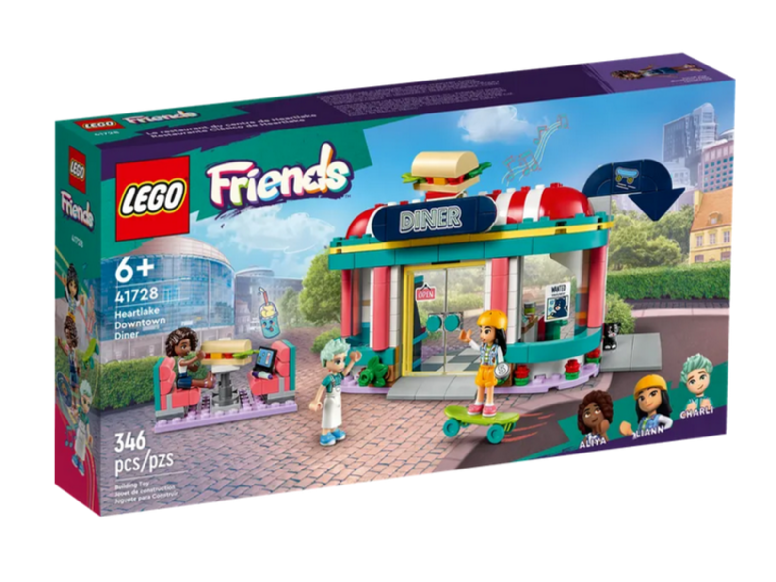 Børn fra 6 år kan udspille masser af historier med restauranttema med LEGO® Friends byggelegetøjet Heartlake diner (41728). Der er masser af tilbehør, som inspirerer til kreativ leg, så børn kan lege, at de laver en sandwich, eller at de er kunder i dineren. Detaljerne omfatter et drive-in-vindue, udendørs siddepladser samt et arkadespil og en jukeboks. Børn kan bruge salatingredienserne i køleskabet til at skabe deres egne sandwiches. Øvrigt tilbehør omfatter 2 drikkevarer, penge, 3 skiver brød til sandwiches, en servietholder, en skraldespand og et skateboard. Der er også en fræk kat, som elsker at besøge dineren!