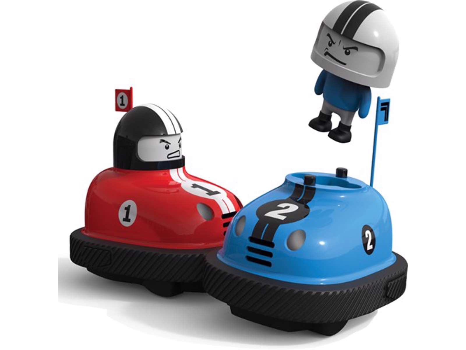 De lavet, så de kan holde til at køre hårdt ind i hinanden som rigtige radiobiler, og skyder de små figurer ud, så de flyver op i luften, når bilerne støder sammen. Bilerne kan styre i alle retninger! Hvor mange gange kan du få din modstanders figur til at flyve ud af sin bil?