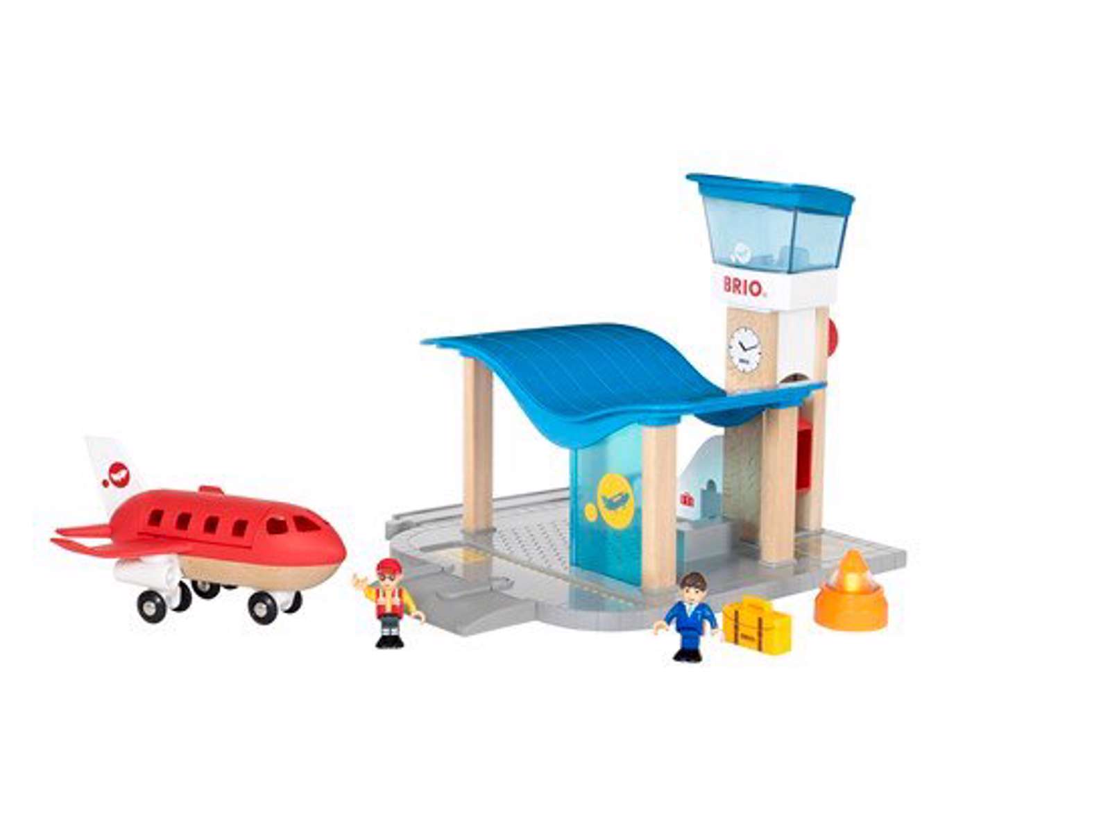 Denne nye stjerne blandt BRIO fly består af en terminal, et flot rødt fly, et komplet bagagebånd med to figurer – og dit BRIO-tog stopper lige uden for.