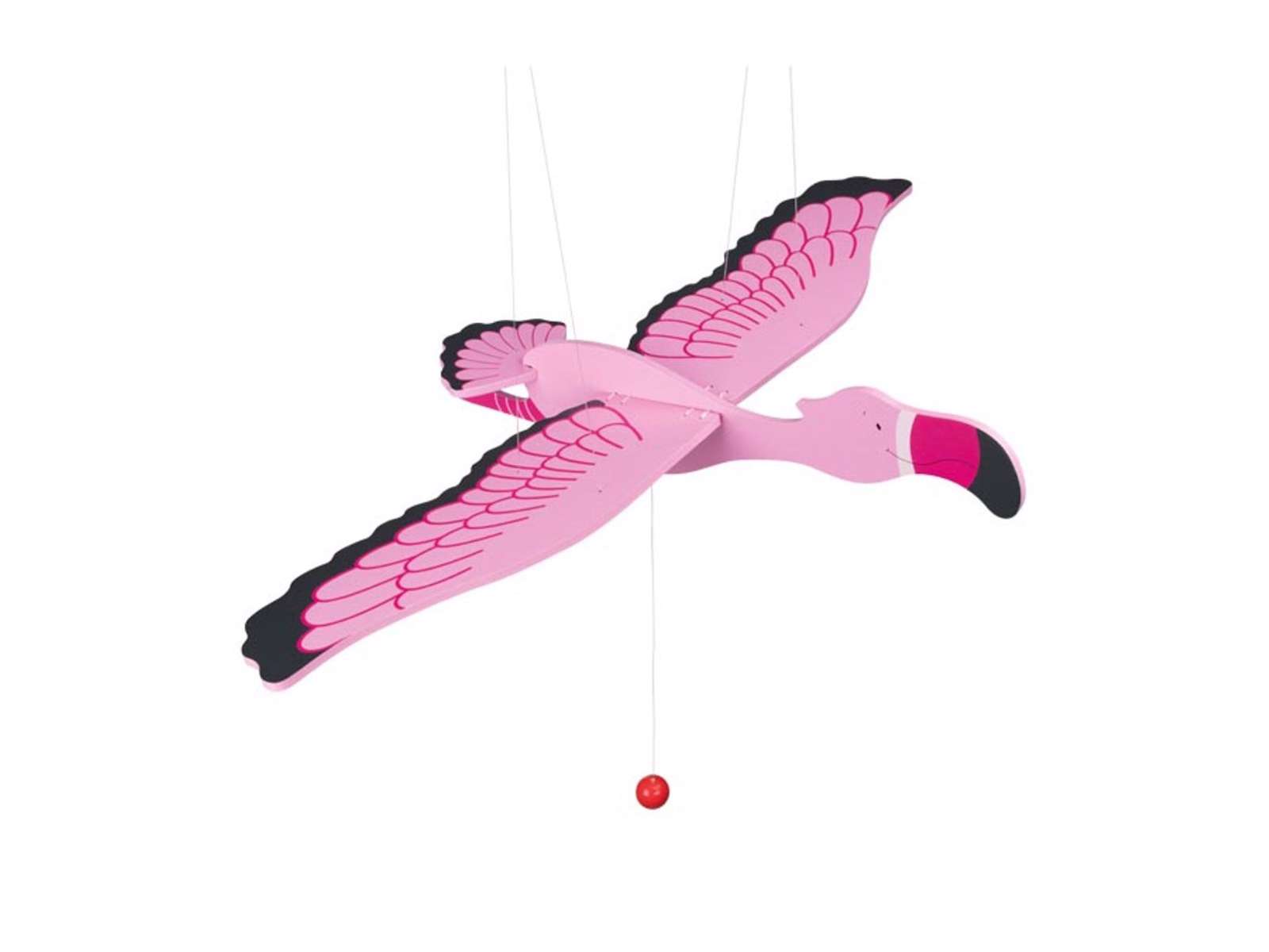 Flot dyrefigur af træ til at hænge op under loftet. Figuren har en vingefang på 50 cm. Når man trækker ned i snoren basker den med vingerne som om den flyver.