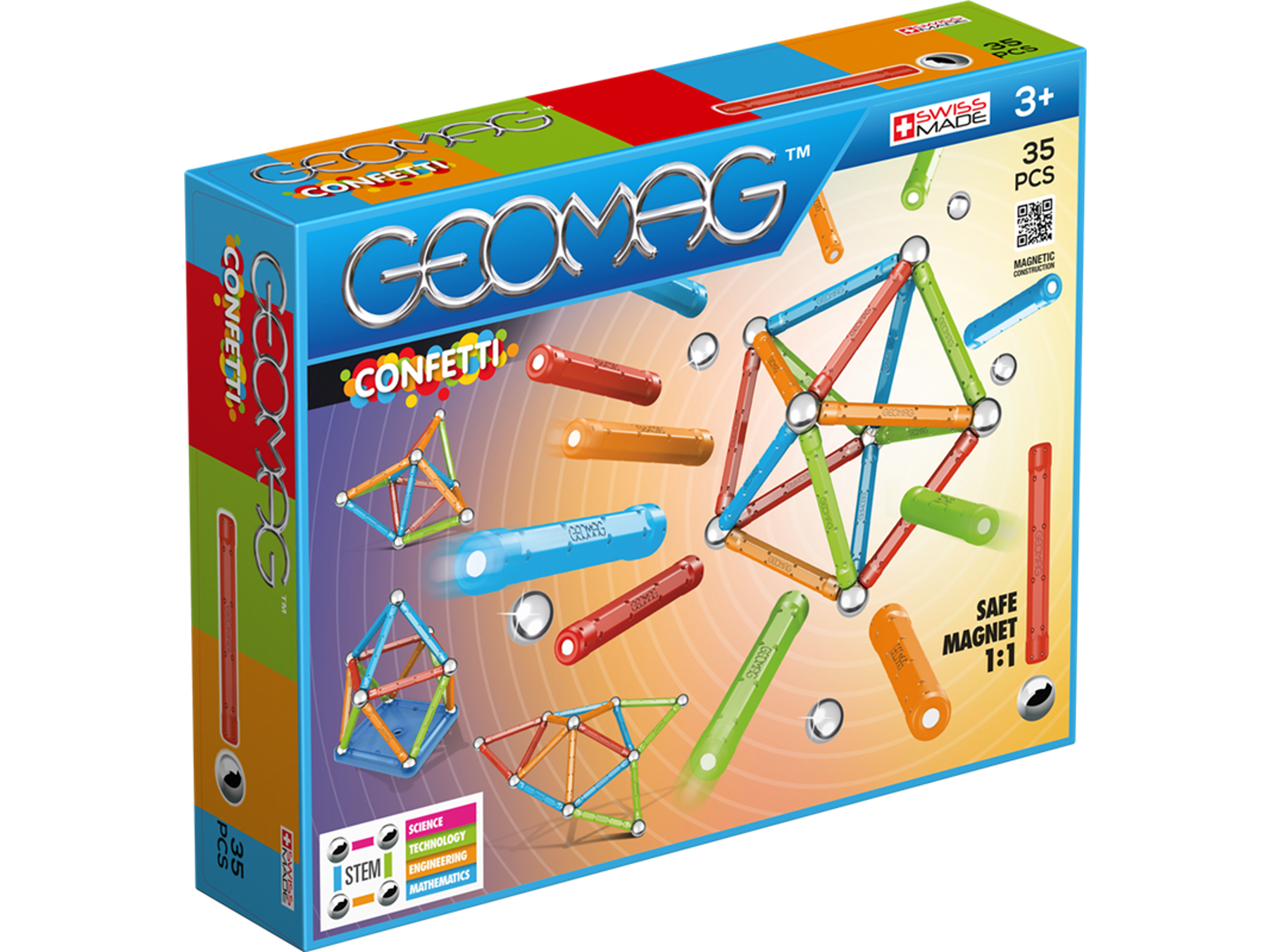 Dette sæt indeholder 35 dele bestående af aflange magneter i forskellige farver, magnetkugler og paneler.