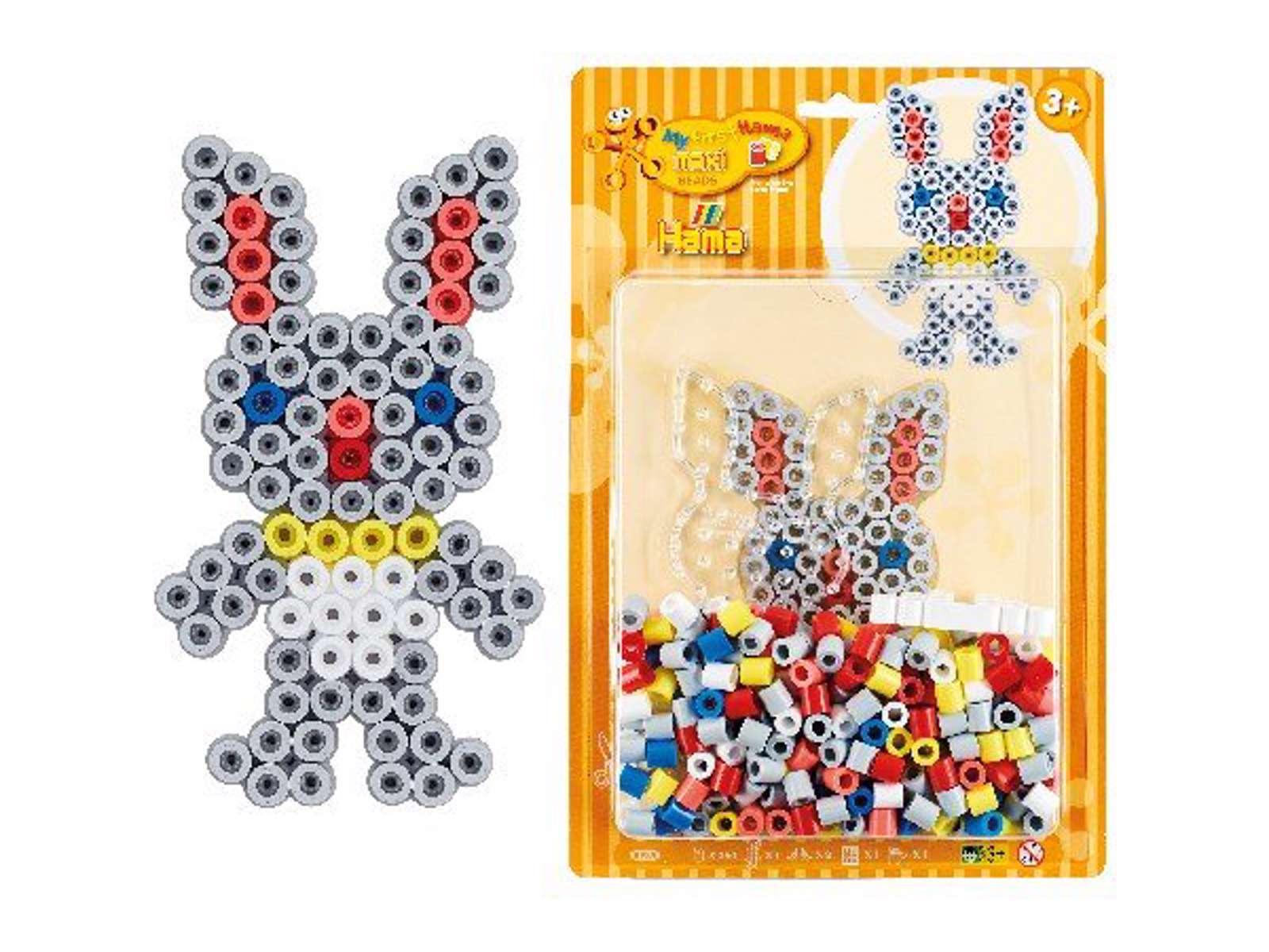 Lav en sjov hoppende kanin med Hama Maxi perler. Pakken indeholder cirka 250 perler, 1 gennemsigtig kanin stiftplade, 2 perlefødder, vejledning og strygepapir.
