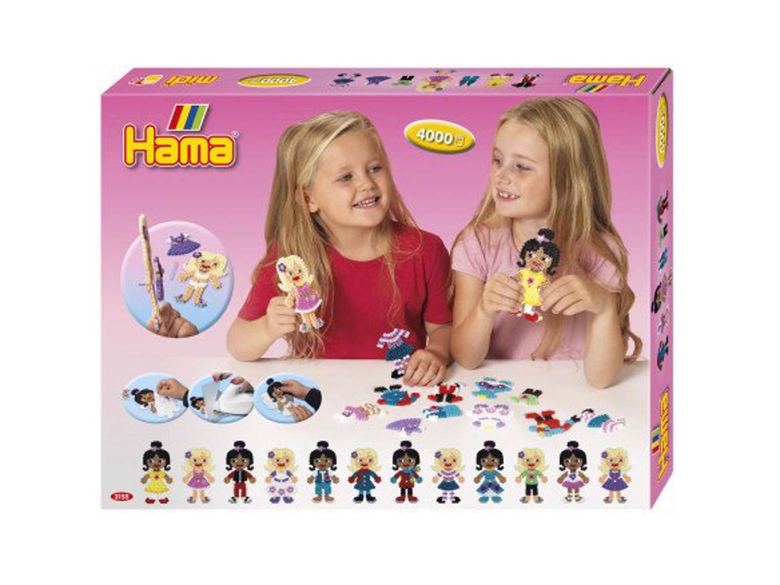 Æsken indholder Ca. 4.000 perler, 1 dukke stiftplade nr. 330, 2 Hama Gems, 2 ark mosgummi, 1 Hama connector, motivark, vejledning og strygepapir.