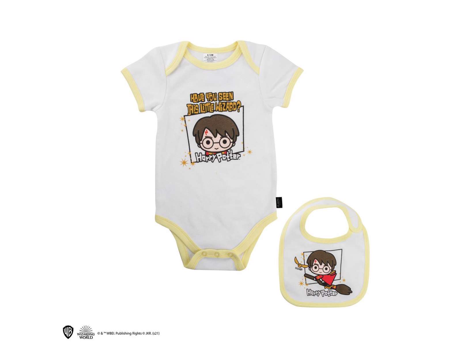 'Have you seen this little wizard!' Bedårende sæt til de allermindste troldmænd, hekse og Harry Potter-fans bestående af en kortærmet bodysuit og en savlesmæk med Hogwarts-tema.