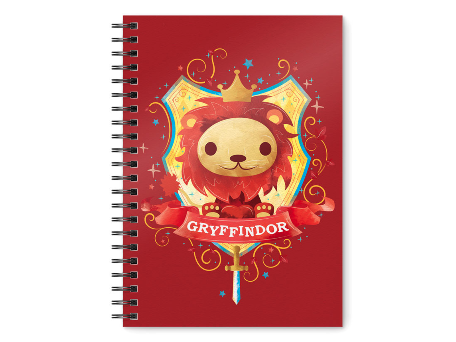 Herlig, rød notesbog i A5 med en nuttet fortolkning af Gryffindors våbenskjold!