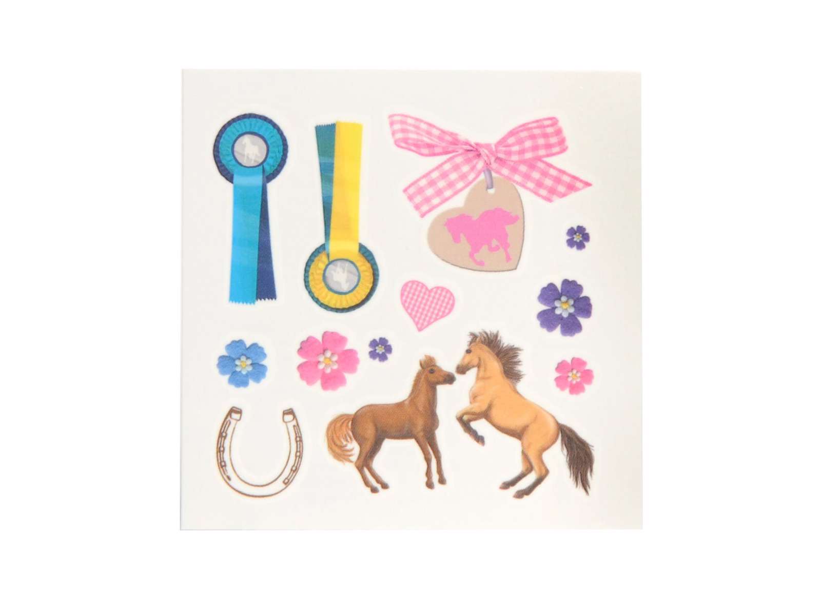 3 små ark med overføringstatoveringer. Tatoveringerne har heste og blomster motiver.
