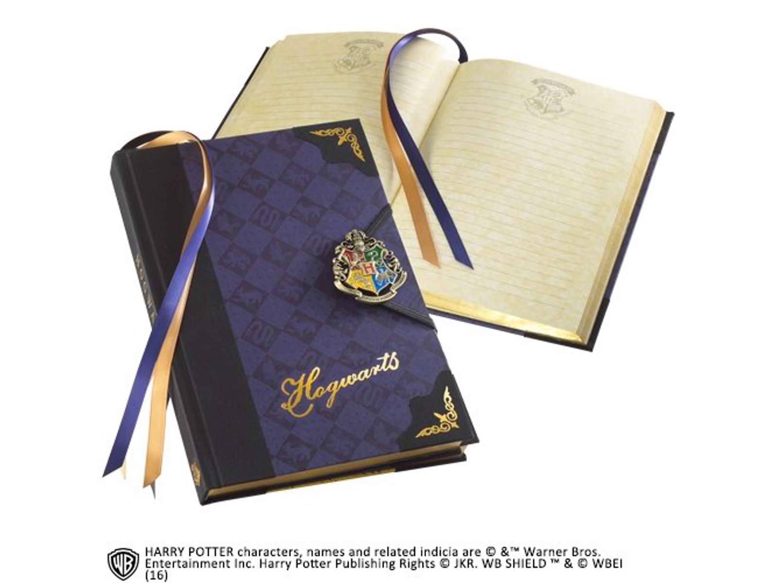 Fin dagbog fra Harry Potter med Hogwarts våbenskjold.